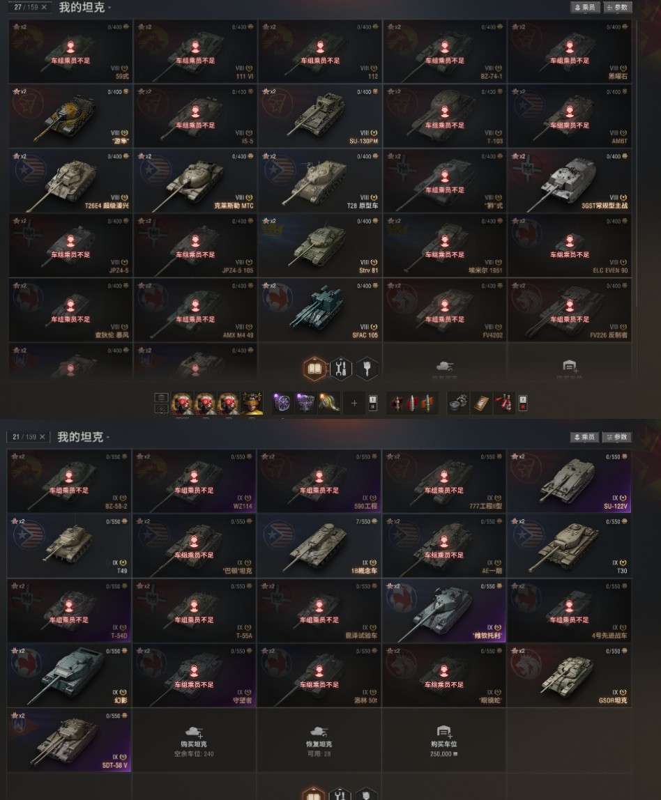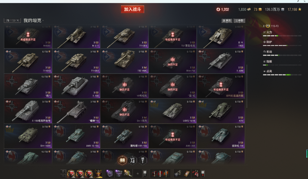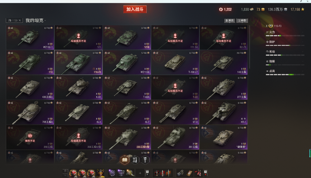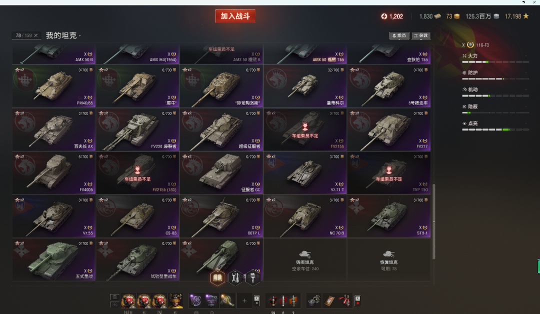 11级KR-1,T803。10级76X全系,所有银币10级全部在库。10金:116F3,铲子豹法蝎等