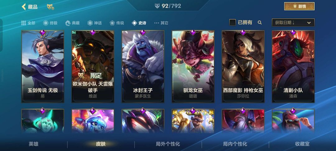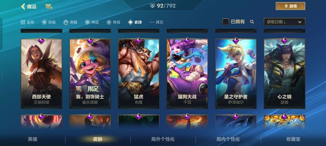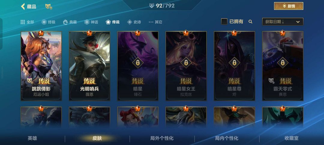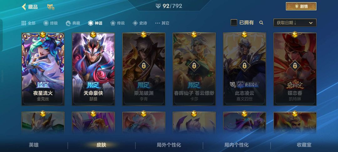 112个英雄,92个皮肤,角色等级170级,排位等级傲世宗师二44星