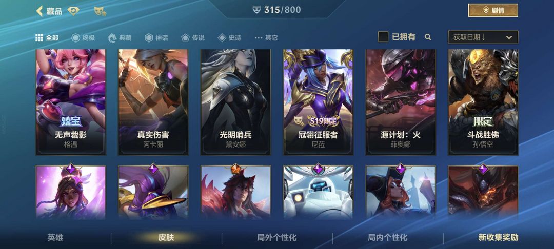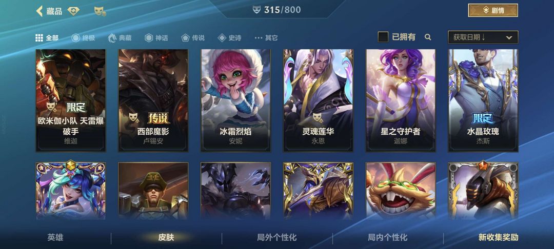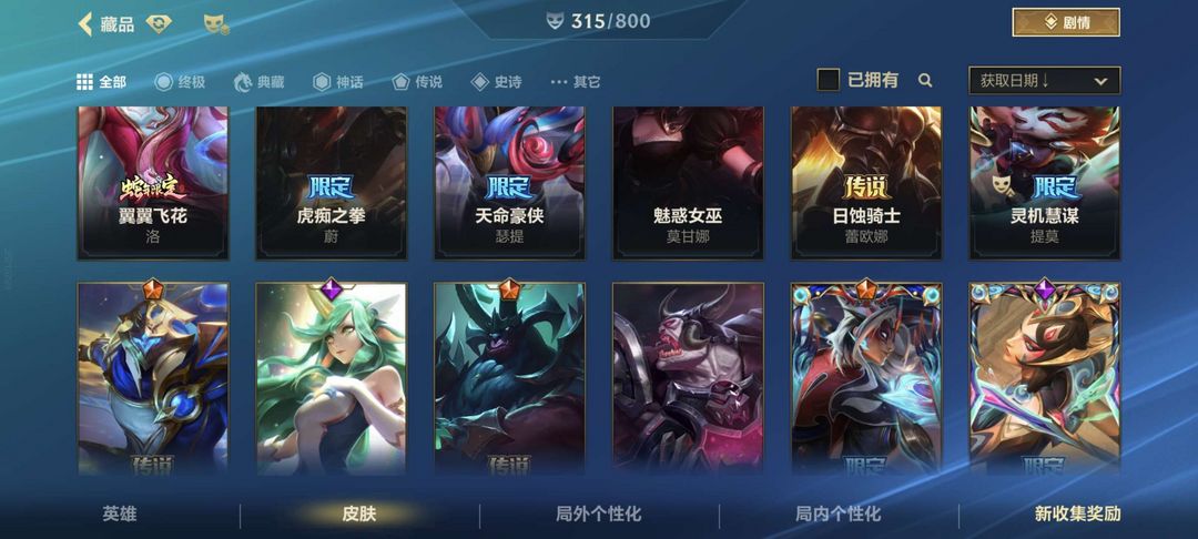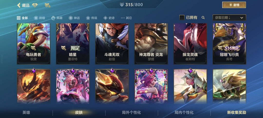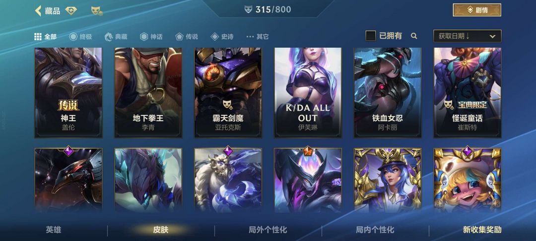 可排位4珍藏百皮精品号全英雄加315个皮肤热门英雄皮肤大部分都有
