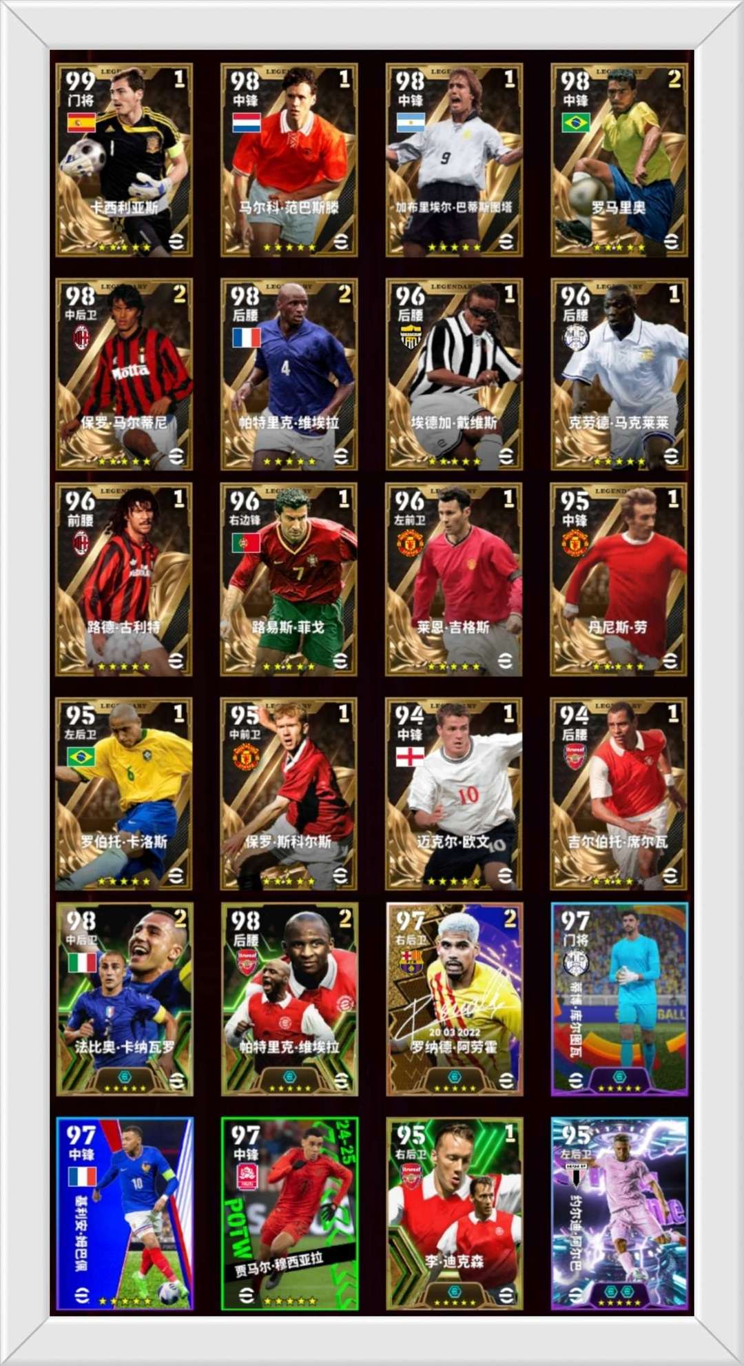 限制: 撤单率<50%才可租用此帐号装备描述:❤️16黄传❤️ ⭕15五星黄传⭕ ⭐卡西利亚斯⭐范巴斯腾⭐巴蒂斯图塔⭐罗马里奥⭐马尔蒂尼⭐维埃拉⭐戴维斯⭐马克莱莱⭐古利特⭐菲戈⭐吉格斯⭐丹尼斯劳⭐卡洛斯⭐斯科尔斯⭐欧文⭐ ⭕1四星黄传⭕ ⭐席尔瓦⭐ ❤4高光❤ ⭕1决胜高光⭕ ⭐单增阿劳霍⭐ ⭕3史诗高光⭕ ⭐单增卡纳瓦罗⭐单增维埃拉⭐单增迪克森⭐ ❤4精选❤ ⭕1梦幻精选⭕ ⭐双增阿尔巴⭐ ⭕3普通精选⭕ ⭐单增库尔图瓦⭐姆巴佩⭐穆西亚拉⭐