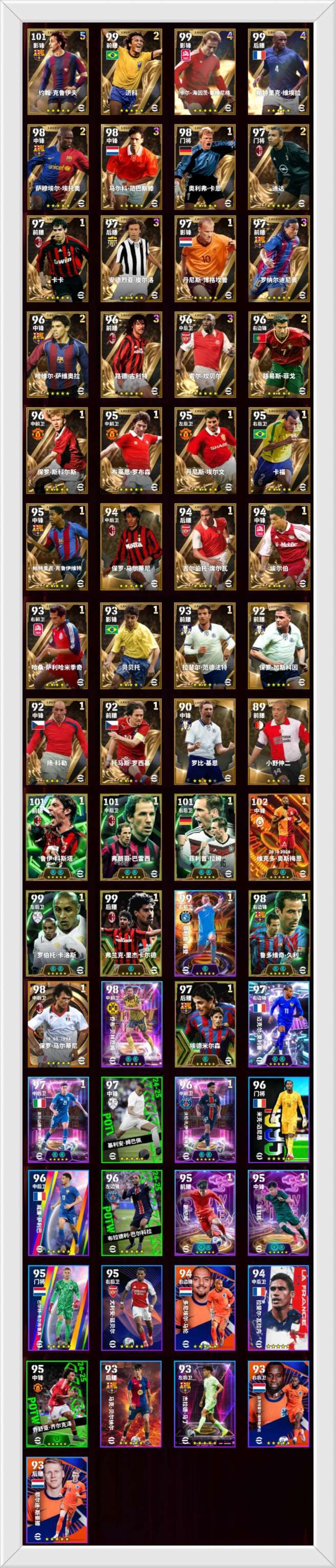限制: 撤单率<50%才可租用此帐号装备描述:❤️32黄传❤️ ⭕23五星黄传⭕ ⭐克鲁伊夫⭐济科⭐鲁梅尼格⭐维埃拉⭐埃托奥⭐范巴斯腾⭐卡恩⭐迪达⭐卡卡⭐皮尔洛⭐博格坎普⭐罗纳尔迪尼奥⭐萨维奥拉⭐古利特⭐坎贝尔⭐菲戈⭐斯科尔斯⭐罗布森⭐埃尔文⭐卡福⭐克鲁伊维特⭐马尔蒂尼⭐加斯科因⭐ ⭕6 四星黄传⭕ ⭐席尔瓦⭐埃尔伯⭐萨利哈米季奇⭐贝贝托⭐范德法特⭐基恩⭐ ⭕3三星黄传⭕ ⭐科勒⭐罗西基⭐小野伸二⭐ ❤9高光❤ ⭕2决胜高光⭕ ⭐双增奥斯梅恩⭐马尔蒂尼⭐ ⭕7史诗高光⭕ ⭐双增科斯塔⭐双增巴雷西⭐双增拉姆⭐双增卡洛斯⭐单增里杰卡尔德⭐双增久利⭐单增埃德米尔森⭐ ❤20精选❤ ⭕7梦幻精选⭕ ⭐单增福登⭐双增贝林厄姆⭐双增奥利塞⭐双增巴斯托尼⭐双增埃梅里⭐双增蒯纪闻⭐双增王钰栋⭐ ⭕13普通精选⭕ ⭐姆巴佩⭐迈尼昂⭐萨利巴⭐巴尔科拉⭐韦尔布鲁真⭐延贝尔⭐马伦⭐瓦拉内⭐齐尔克泽⭐贝尔纳尔⭐马丁⭐海特勒伊达⭐斯豪腾⭐