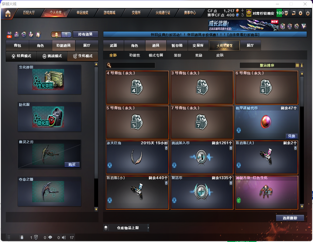 时空猎手✨15个生化皮肤✨斯泰尔蝴蝶小毒蜂✨四防生化角色✨炼狱带皮✨满榴弹不退包满弹匣✨无炽芒蝶刃