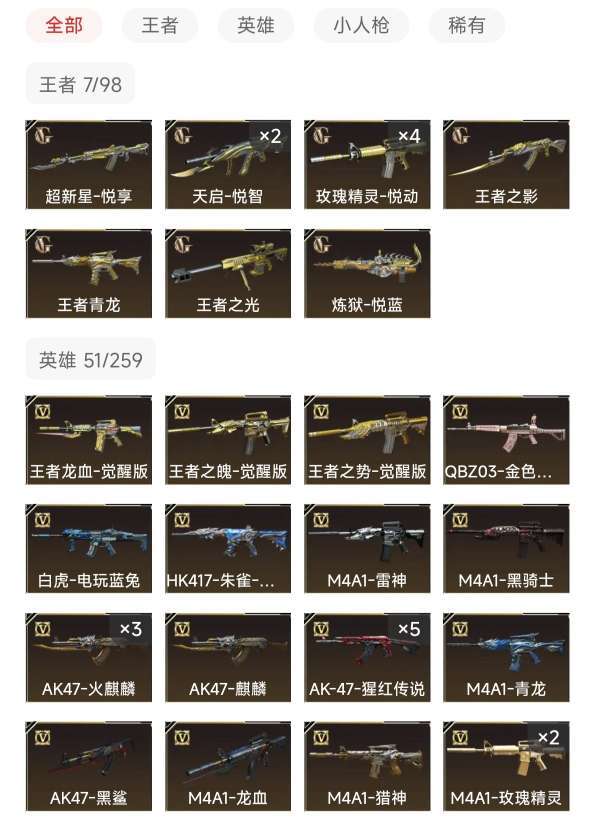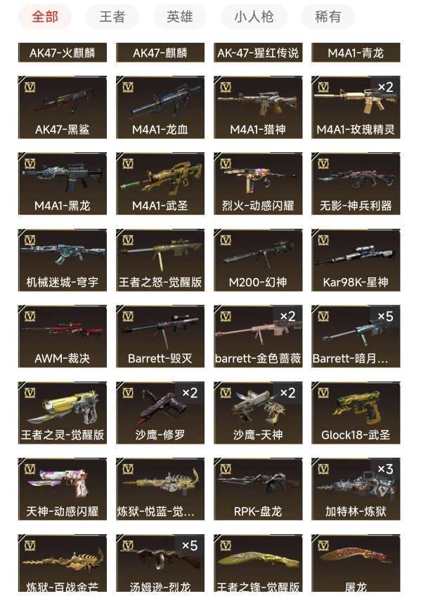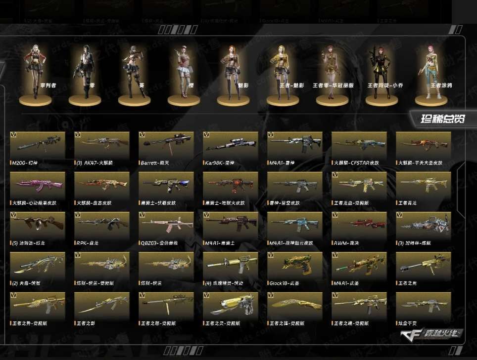装备描述:84V,16王者,3炫金,毁灭英雄计划 /毁灭墨兰/毁灭风暴/天龙CFSTAR/火麒麟CFSTAR/火麒麟平天大圣/火麒麟心动糖果/火麒麟盘古/曹操/AK47雷神/审判者/_零/_葵/_樱/魅影/M200-幻神/98k-星神/5烈龙/Barrett-毁灭/barrett-金色蔷薇(2)/Barrett-暗月传说(5)/王者之怒-觉醒版/M4A1-黑骑士音效卡/Barrett-毁灭音效卡/天神-动感闪耀 音效卡/炼狱-百战金芒-庆典舞曲音效卡(展示段位不代表实际段位,如赛季更新等不可抗拒因素发生变化、时限道具不保证所剩时间,