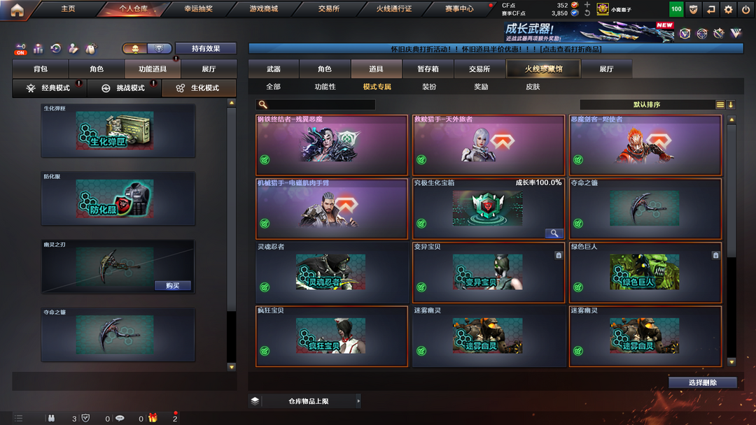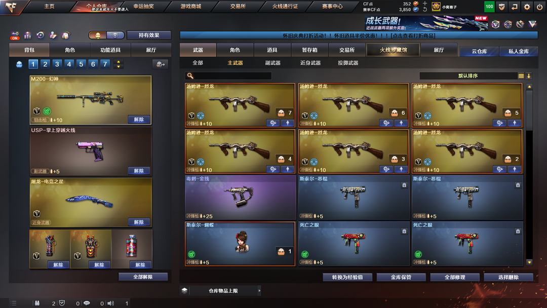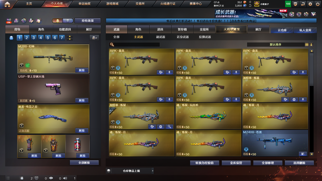 装备描述:王者武器:王者之光-觉醒版;王者之啸-觉醒版;王者炎心;王者冰魄;王者之幻;王者之翼;王者之力-觉醒版;王者之武;王者之心 英雄武器:白虎-电玩蓝兔;烟雾弹-云龙;屠龙;RPK-盘龙;M4A1-黑骑士;黑武士-锦绣游龙;龙啸-烈火龙威;烈火-动感闪耀;天神-动感闪耀;屠龙-动感闪耀;手雷-动感闪耀;无影-神兵利器;AK47-火麒麟;沙鹰-天神;QBZ03-金色蔷薇;AK12-天启;汤姆逊-烈龙;9A91-烈火;Scar Light-白虎;M200-幻神;HK417-朱雀;加特林-炼狱;龙啸;M4A1-黑龙;AK47-无影;沙鹰-修罗;龙啸-堕天神;烟雾弹-堕天神;高爆手雷-堕天神;闪光弹-堕天神;麒麟刺-堕天神;黑武士-CF网剧冠军;AK47-B-战神;AA-12-雷霆;AK47-B-战士;AWM-裁决;擎天;Barrett-暗月传说;M4A1-雷神;麒麟刺;AK47-黑鲨;Barrett-毁灭;M4A1-千变 角色:樱;迷迭香;猎狐者;潘多拉;黑鹰;雷霆-β;复仇者;雅典娜;堕天使;活力灵狐;夜玫瑰;威锋;陈龙野-Y;娜塔莎;救世复仇;救世主;灵狐者;烈锋;王力宏;王者零-传说之路