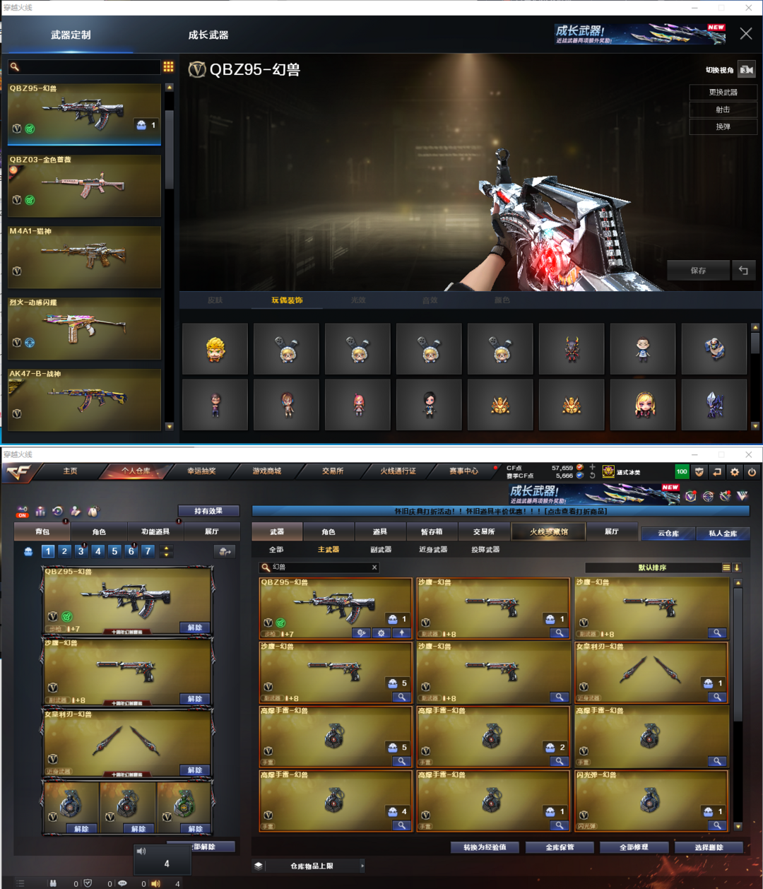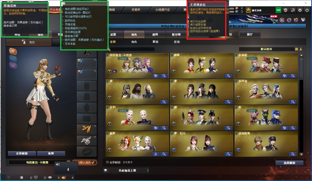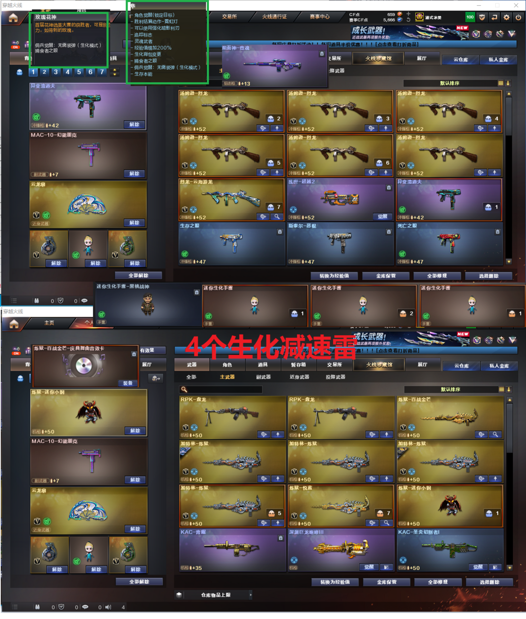 装备描述:排位:可以----------生化四防(可以变更背包、看僵尸血量)无需换弹、6烈2盘、6炼狱、炼狱小刚、异变清道夫、VSK-94-金蚀、死亡之眼、手斧镜、4个生化减速雷、生化弹匣、全部弹匣、、、、、、、爆破四防:幻神3皮+音效(宠儿、N9、丹凤皮肤)、M200-竞技荣光、98K星神、、、、、USP雷暴、COP堕天神、COP幻灵、柯尔特竞技荣光、、、、QBZ幻兽、玄豹白虎、QBZ金色蔷薇、、、幻神音效、裁决音效、雷神音效、毁灭音效、炼狱音效、黑骑士音效、、、5套幻兽、2套夜魔、3套幻灵、3套竞技荣光、1套神工天巧、1套云龙、2套玄豹、1套雷霆王者、、、生化四防(隼、玫瑰花神)、爆破四防(王者潘多拉、云悠悠、机械姬、玄豹)