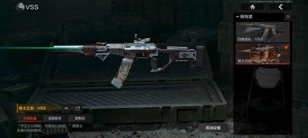 装备描述:近战武器:霜狼生存刀,急袭弯刀,冬日冰镐,盘牙彻甲短刃,工兵铲,鲨鱼刀,突击匕首,野战折刀,瑞兔折刀;枪皮:深潜行者1在自由搭配里面 苏梅克SKS,橄榄绿M96,碳黑M9A3,北国内卫沙漠之鹰,盛冬S12K,雪地数码USAS12,现代化SPR310,兔年春季P90,滑雪季UMP45,北国内卫MAC10,荒漠涂绘T79,最后防线Vector45,都市黄Vector9,滑雪季Suomi,缟兵玄墨AKM,竞技M4A1,林中人FAL,伦琴幻影H416,深水浴池DTMDR,骑士之剑AKS74U,赢家F2000,炎夏浪花AR57,骑士之剑ACE31,盛冬AN94