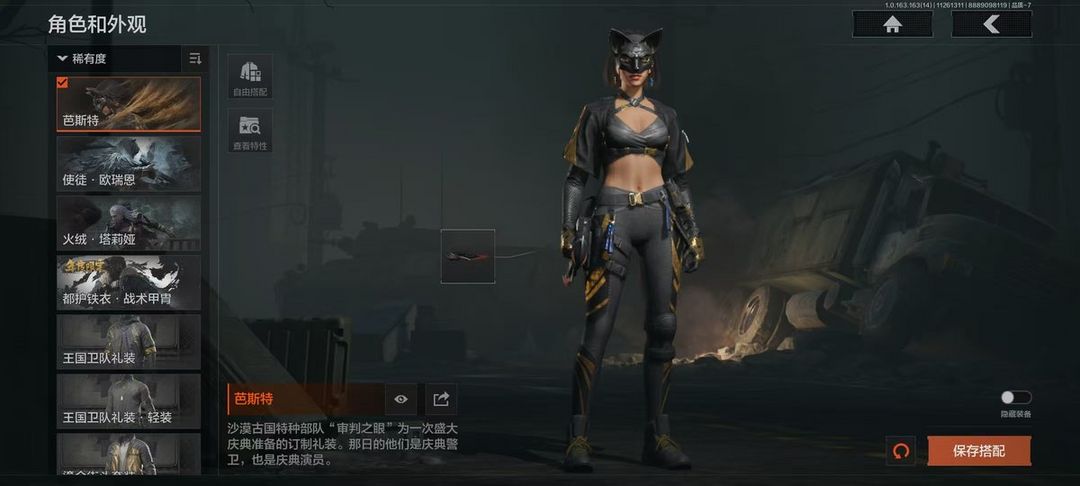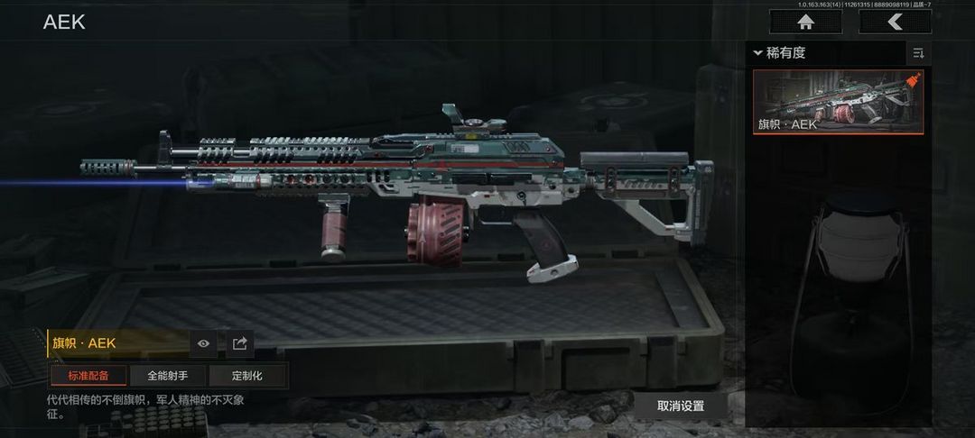 装备描述:30级,历史最高段位:暗区传说;【近战武器】:苍穹利爪,收割者,S-07折刀,赢家匕首,热能武器补牢,三尺万仞战术剑,寒牙手刺,贝利亚黄昏,来战开山刀;【手套】:玉鸾挂枝手套,角弓得控手套;【角色皮肤】:芭斯特,使徒欧瑞恩,火绒塔莉娅,都护铁衣战术甲胄,王国卫队礼装,王国卫队礼装轻装,鎏金街头套装,森林守望特种服,林地作战服;【突击步枪】:包络战术AKM,棱光裂变AKM,火力倾泻AKM,缟兵玄墨AKM,猩红抓痕AKM,骤羽尖啸M4A1,幻域莎绫M4A1,德尔塔小队M4A1,伦琴幻影FAL,竞技MDR,逆火MDR,洞窟遗迹AK102,加速地带AK102,战术大师AK74N,棱光裂变AK74N,来战AK74N,山地伪装AK74N,莫克斯AKS74U,龙影AKS74U,坚守AKS74U,火绒AKS74U,火力倾泻AUG,告丧夜曲AUG,战术大师AUG,雪山之王F2000,醒目提示F2000,赢家F2000,炎夏浪花AR57,涂绘猎人AR57,告丧夜曲AR57,深粉玫瑰ACE31,棱光裂变ACE31,旗帜AEK,火绒AN94,盛冬AN94,虎纹Groza,典礼武备Groza,绿松石数码Groz