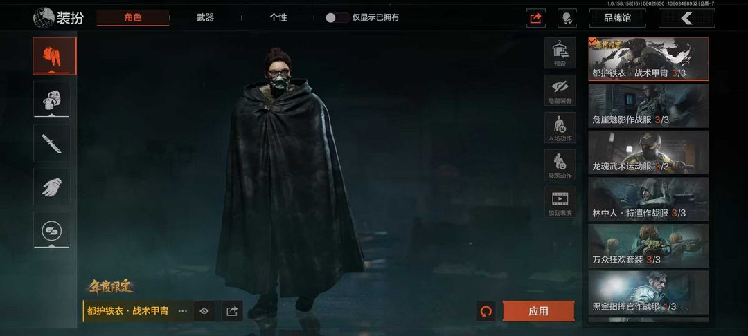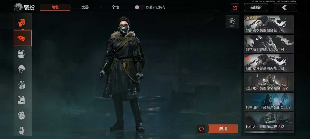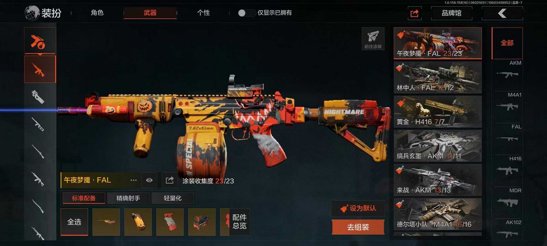 装备描述:角色皮肤】:都护铁衣战术甲胄,危崖魅影作战服,龙魂武术运动服,龙魂武术运动服,林中人特遣作战服,万众狂欢套装;【装备涂装】:都护铁衣装备组合包,散花海Ⅱ装备组合包,瀚海军行装备组合包,过江龙装备涂装组合,涂装-林中人特遣作战服;【近战武器】:三尺万仞战术剑,下弦月,明刀绣春,龙魂双节棍,急袭弯刀,霜狼生存刀,精英指虎,瑞兔折刀,冰海战斧,突击匕首,工兵铲,来战开山刀;【手套】:玉鸾挂枝手套;【突击步枪】:午夜梦魇FAL,林中人FAL,黄金H416,缟兵玄墨AKM,来战AKM,德尔塔小队M4A1,自喷网格H416,来战AK74N,山地伪装AK74N,无声暗月AR57,骑士之剑ACE31,缟兵玄墨T03,玄戈梨花T03,林地数码T03;【冲锋枪】:长缨风掣Vector9,无声暗月MP5,龙威MP5,缟兵玄墨MPX,玄戈梨花MPX,危崖敌影MPX,兔年春季限定;【射手步枪】:缟兵玄墨VSS,玄戈梨花VSS,白狼连队VSS,缟兵玄墨M110,玄戈梨花M110,午夜梦魇M110,全地形数码M110;【栓动步枪】:长缨风掣AX50,无声暗月AX50