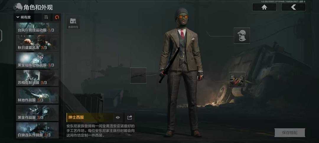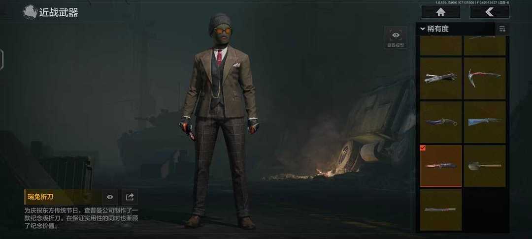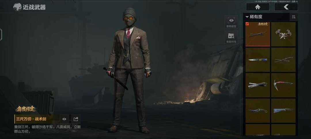 装备描述:近战武器:三尺万仞战术剑,寒牙手刺,涂鸦利刃,明刀绣春,龙魂双节棍,冬日冰镐,急袭弯刀,霜狼生存刀,瑞兔折刀,工兵铲,来战开山刀;手套:玉鸾挂枝手套,角弓得控手套,冬日手套;枪皮:秋宴AKM,竞技FAL,黄金M4A1,蓝色咆哮H416,涂鸦AK102,北国内卫MDR,黄金AK74N,骑士之剑AKS74U,湖冰倒影MP5,雪山之王MPX,星云火花P90,苏梅克UMP45,香蕉MP40,北国内卫MAC10,沙色Vector45,长缨风掣Vector9,龙影Suomi,玄戈梨花VSS,冰河碎影MK14,焰色反应M110,绿松石数码QBU191,白色丧钟莫辛,长缨风掣AX50,秩序F2000,水果AR57,骑士之剑ACE31,最后防线AEK,北国内卫AN94,玄戈梨花T03,冬夜AK12,07式林地迷彩QBZ191,滑雪季M24,骑士之剑SJ16,长缨风掣RPK16,盛冬S12K,特维拉防卫M870,北国内卫MP133,涂鸦G18C,香蕉沙漠之鹰