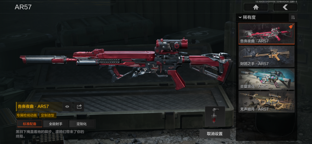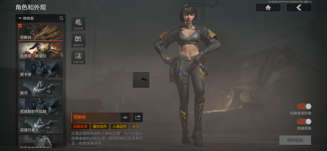 装备描述:历史最高段位:暗区传说【角色皮肤】:芭斯特,白蔷薇斯黛拉,黑卡蒂,冥河,深潜行者II,和平先锋作战套装,财团之手作战套装,金狮护身转运套装,高地武士套装,王国卫队礼装轻装,公司成员套装,鎏金街头套装,速度新星赛车服;【近战武器】:苍穹利爪,下弦月,急袭弯刀,工兵铲;【手套】:冬日手套;【突击步枪】:包络战术AKM,和平先锋AKM,火力倾泻AKM,潜渊蛇鳞M4A1,幻域莎绫M4A1,地脉深处FAL,鱼跃丹青MDR,竞技MDR,玄墨披挂MDR,玄墨披挂AK102,洞窟遗迹AK102,包络战术AK74N,战术大师AK74N,熔星AKS74U,火绒AKS74U,熔岩AUG,醒目提示F2000,危崖敌影F2000,深潜F2000,炎夏浪花AR57,告丧夜曲AR57,财团之手AR57,无声暗月AR57,动感舞步ACE31,战术大师ACE31,起火点AN94,近卫标记Groza,骑士之剑Groza,熔岩Groza,典礼武备Groza,虎纹Groza,骤羽尖啸FAMAS,虎纹FAMAS,骑士之剑SCAR,绿海猎手SCAR,青瓷涂层SCAR,巡林客T951,宝石籽料T951,伦琴计量T951,冻土条纹T