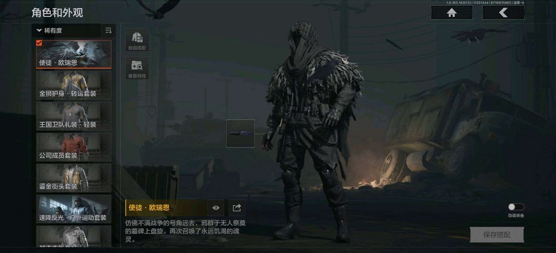 装备描述:使徒欧瑞恩,鎏金街头套装,速降反光户外运动套装,都市夜影套装 竞技FAL,包络战术AKM,冻原猎手M4A1,告丧夜曲AUG,旗帜AEK,旧王圣谕QBZ191,和平之手FAL,来战AKM,鱼跃丹青DTMDR,竞技MDR,北国内卫MDR,自喷网格H416,棱光裂变AK102,火力倾泻AUG,伦琴计量AK74N,棱光裂变AK74N,来战AK74N,莫克斯AKS74U,骑士之剑AKS74U,最后防线AKS74U,炎夏浪花AR57,棱光裂变ACE31,骑士之剑ACE31,最后防线AEK,粉绒臻选AN94,伦琴计量AN94,北国内卫AN94,巡林客T951,伦琴计量T951,利齿风暴T03,鱼跃丹青MCX,骤羽尖啸AK12,火绒AK12,07式林地迷彩QBZ191;利齿风暴MPX,脊峰速降MPX,高塔之内P90,灰鼠幻歌P90,禁止访问UMP45,利齿风暴T79,超越自我Vector9,战术大师Suomi;旧王圣谕VSS,骑士之剑VSS,高塔之内VSS,玄戈梨花VSS,冻原猎手VSS,伦琴计量SVDS,典礼武备MK14,骑士之剑MK14,鱼跃丹 伦琴幻影AX50栓动步枪,超越自我AR30