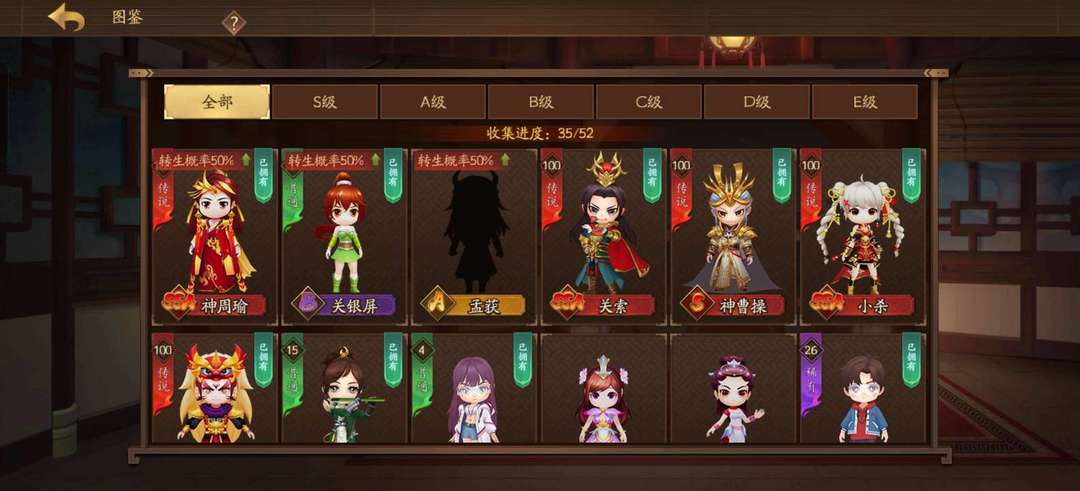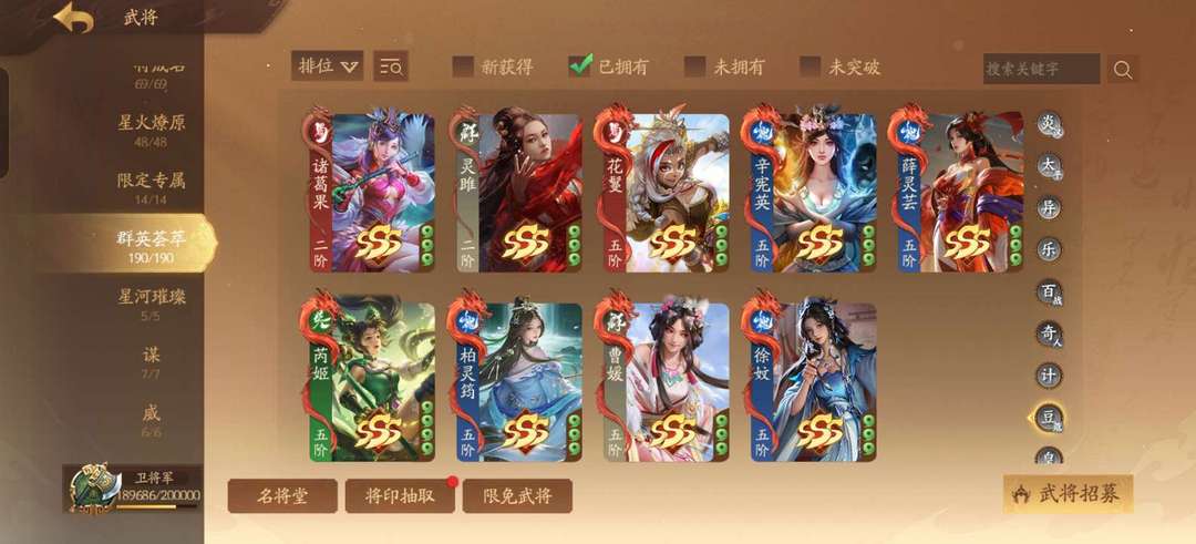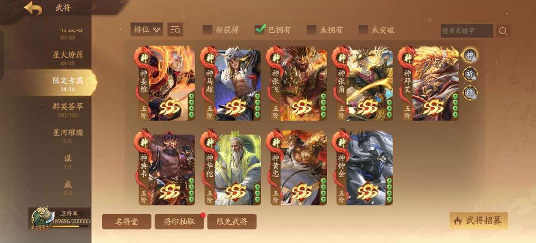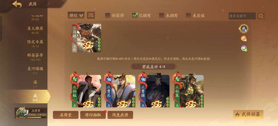 装备描述:6个威武将,7个谋武将,神武除了许褚孙权庞统都有(附带皮肤),祈福香香关索张琪瑛,乐武将4个,其他强力的签子盒子武将周宣,许倩,桓阶,钟毓,诸葛京等等的都有