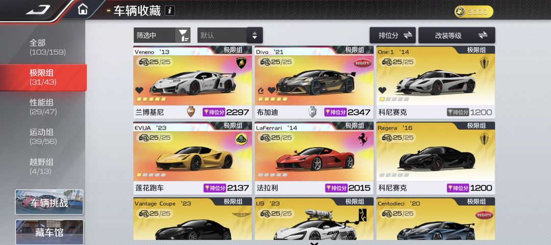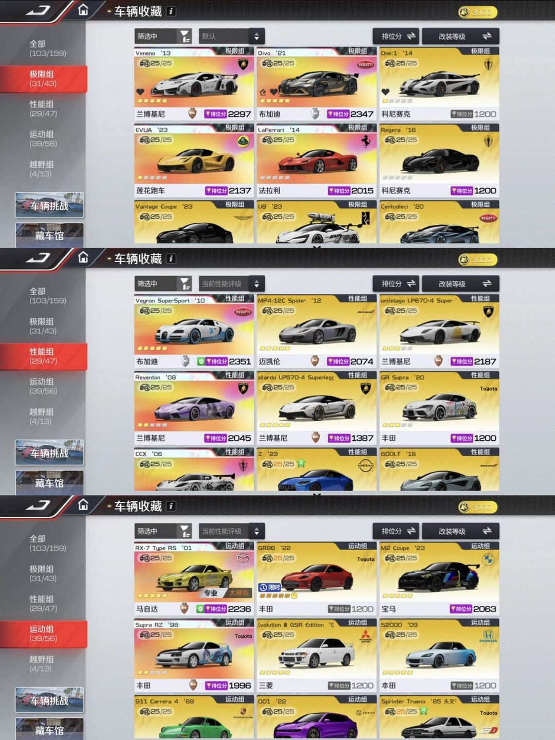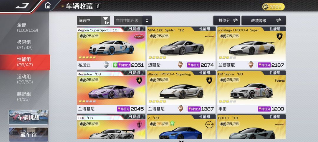 装备描述:不要乱动资源 不要升级车辆改装 不要动钻石,后续还要用来升级其他车辆,谢谢!!! 极限组:T0金车基本齐全满改 性能组:T0基本满改 运动组:T0金