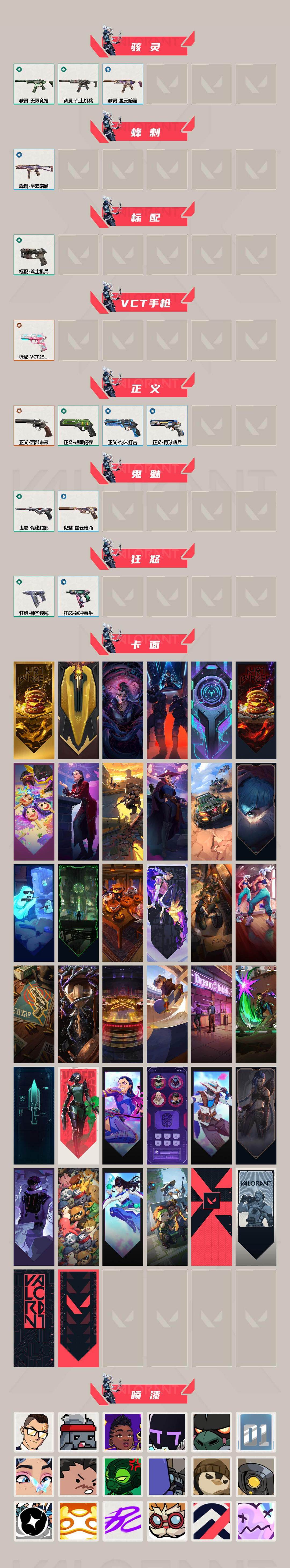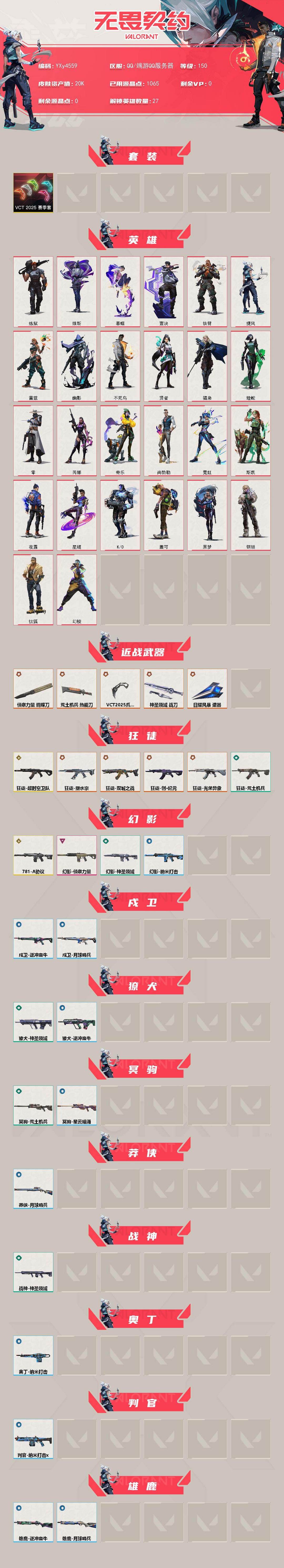 装备描述:冻结三分钟内解除,短信通知重新上即可!喜欢收藏不迷路、游戏异常进小黑屋、时间不够请提前续租或者不要开局 【套装】:VCT 2025 赛季套装 【英雄】:幻棱,炼狱,维斯,暮蝶,钛狐,壹决,铁臂,捷风,雷兹,幽影,不死鸟,贤者,猎枭,蝰蛇,零,芮娜,奇乐,尚勃勒,霓虹,斯凯,夜露,星礈,K/O,盖可,黑梦,钢锁 【近战武器】:近战武器-侦察力量 蝴蝶刀,近战武器-VCT 2025 爪刀,近战武器-荒土机兵 热能刀,近战武器-神圣领域 战刀,近战武器-日耀风暴 遗器 【狂徒】:狂徒-超时空卫队,狂徒-双城之战,狂徒-塑水宗,狂徒-创·纪元,狂徒-光荣异象,狂徒-荒土机兵 【幻影】:幻影-781-A协议,幻影-侦察力量,幻影-神圣领域,幻影-纳米打 【戍卫】:戍卫-逆冲蛮牛,戍卫-月球哨兵 【獠犬】:獠犬-神圣领域,獠犬-逆冲蛮牛 【冥驹】:冥驹-荒土机兵,冥驹-星云暗涌 【莽侠】:莽侠-月球哨兵 【战神】:战神-神圣领域 【奥丁】:奥丁-纳米打 【判官】:判官-纳米打x 【雄鹿】:雄鹿-逆冲蛮牛,雄鹿-月球哨兵 【骇灵】:骇灵-荒土机兵,骇灵-无限竞技,骇灵-星云暗涌 【蜂刺】:蜂刺-星