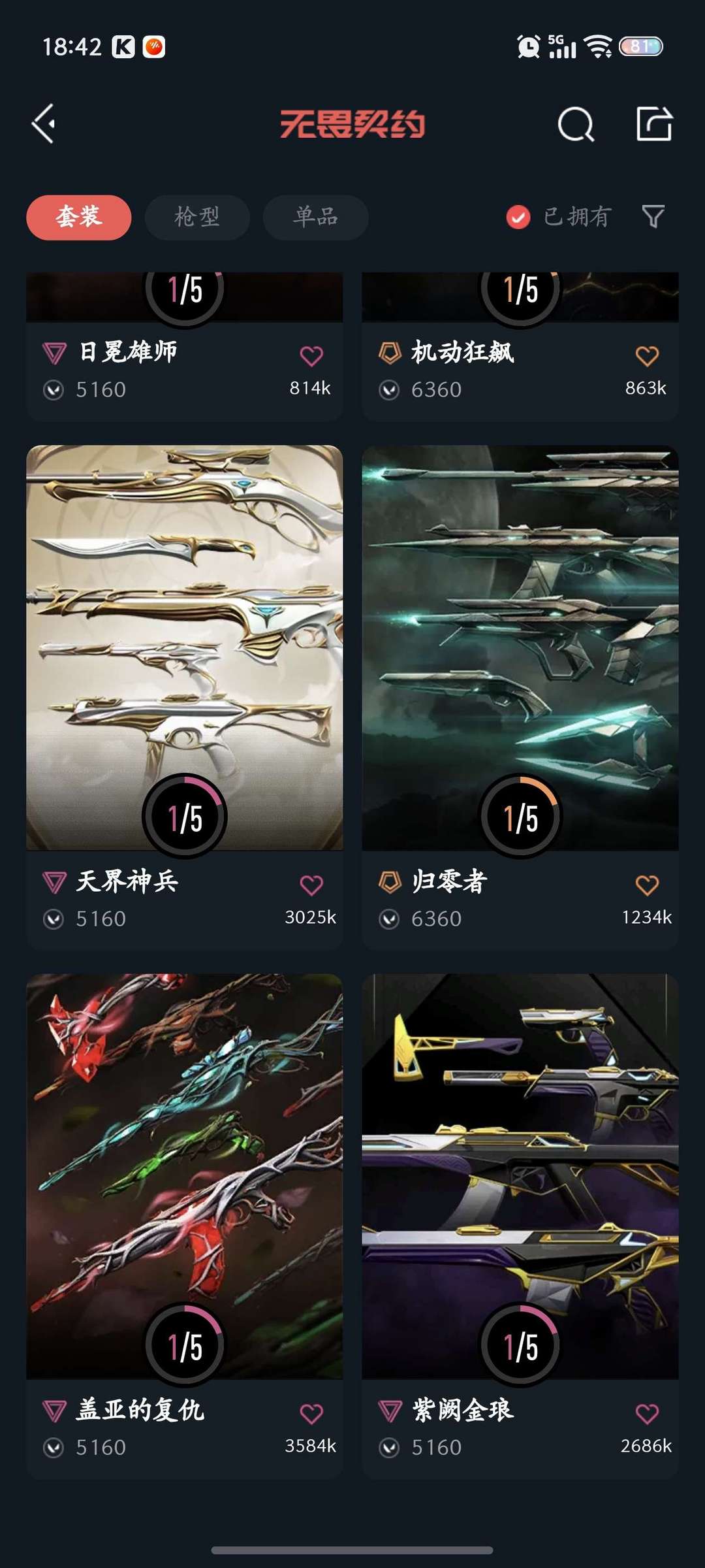 装备描述:刀 vct 影勾 暗夜怪谈镰刀 反手双形态 ak 紫金 盖亚 超时空 机动 雄狮 掠影 m4 黯夜 掠影 正义 西部 大狙 归零者 鬼魅 天界 獠犬 黯夜 鸟狙 怪谈