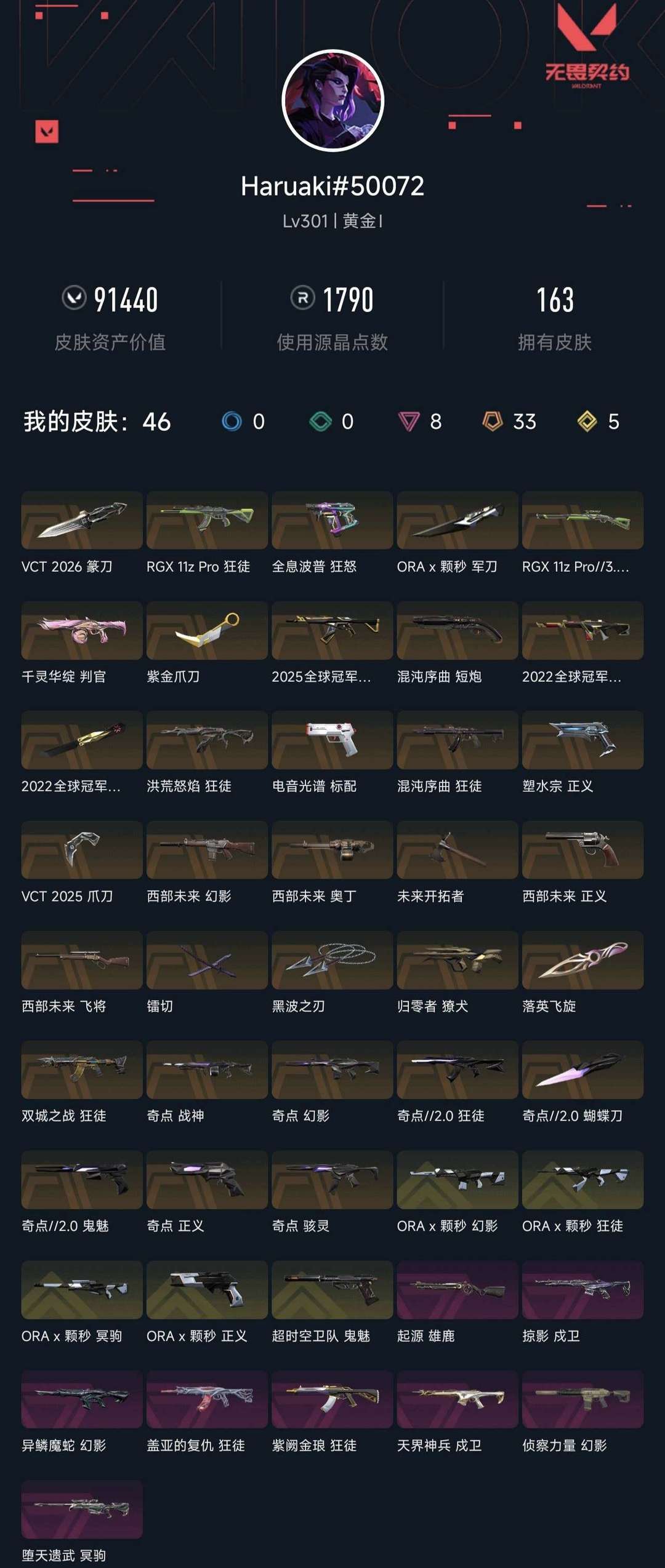 装备描述:此号已经在网络公安备案如有发现,毁号,封号将会走法律程序,禁止挂机退游戏! 近战武器(10)VCT2026篆刀 VCT2025爪刀 22冠军蝴蝶刀 颗秒军刀 黑波 奇点2.0蝴蝶刀 落樱飞旋 镭切 未来开拓者 紫金爪刀 标配(1)电音光普 短炮(1)混沌序曲 狂怒(1)全息波普 鬼魅(2)超时空卫队 奇点2.0 正义(3)奇点2.0 颗秒 西部未来 塑水宗 蜂刺(0)四个贴图皮 骇灵(1)奇点2.0 雄鹿(1)起源 判官(1)千灵华绽 獠犬(1)归零者 戍卫(2)天界神兵 掠影 幻影(6)22冠军 颗秒 西部未来 奇点 侦查 蛇年 狂徒(8)25冠军 双城 颗秒 混沌 流脓 显卡 盖亚 紫金 飞将(1)西部未来 冥驹(2)颗秒 堕天遗武 战神(1)奇点 奥丁(1)西部未来 莽侠(1)显卡3.0 追猎(0) 套装(3):奇点回火 西部未来 22冠军 颗秒 限定(5)VCT2026篆刀 VCT2025爪刀 22冠军蝴蝶刀 22冠军幻影 双城之战 贴图皮:2024年9月通行证到目前所有通行证皮肤(包括活动送的) 超多挂件可使用。