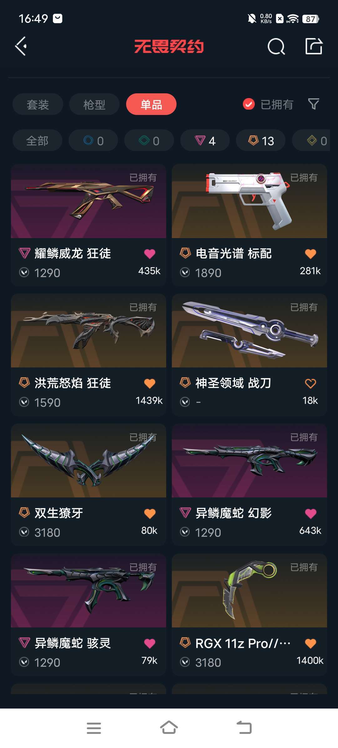 装备描述:无畏契约 ak流脓,混沌,奇点,塑水,威龙,掠夺 m4莲花,魔蛇 刀皮三把,奇点蝴蝶,显卡爪,蛇刀