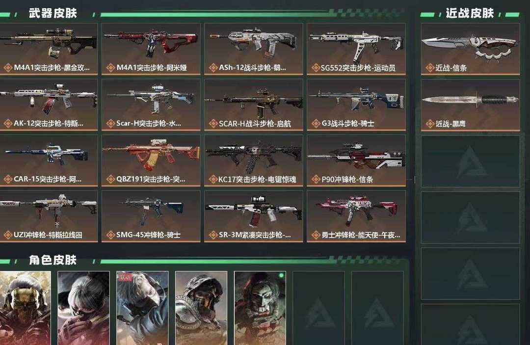 装备描述:红狼-蚀金玫瑰,骇爪-水墨云图,蜂医-送葬人·无题密令,深蓝-不破誓约,红狼-电锯惊魂 【近战皮肤】:近战-信条,近战-黑鹰 【传说外观】:M4A1突击步枪-蚀金玫瑰,M4A1突击步枪-阿米娅,ASh-12战斗步枪-鹅鸭杀,SG552突击步枪-运动员,AK-12突击步枪-特斯拉线圈,SCAR-H战斗步枪 0AR19T