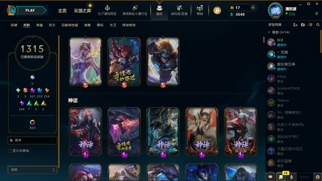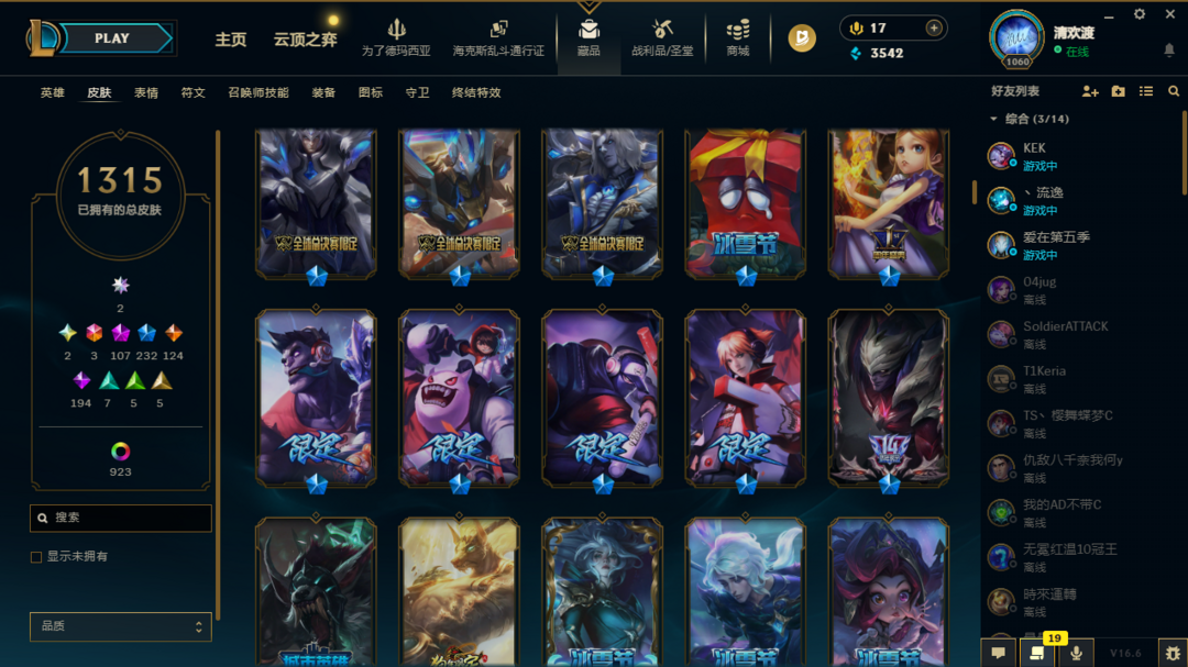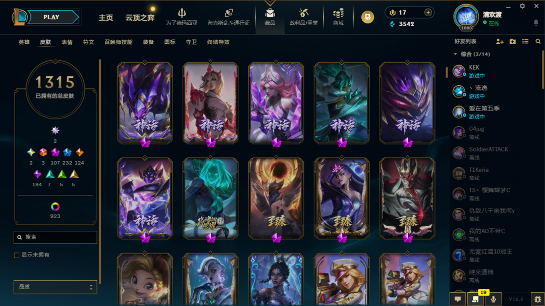 装备描述:共1315原皮,107神话、231限定、123传说、194史诗喜欢本账号请点 ☆收藏☆ 方便下次租用,谢谢光临惠顾!