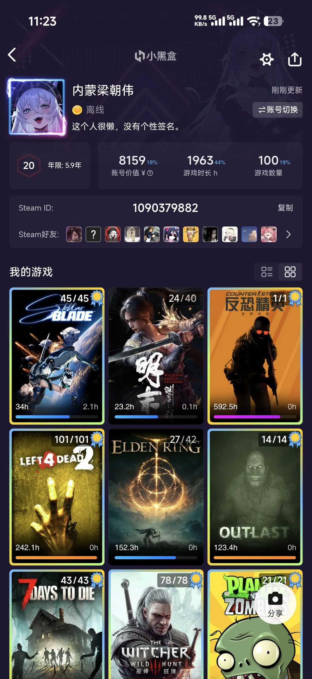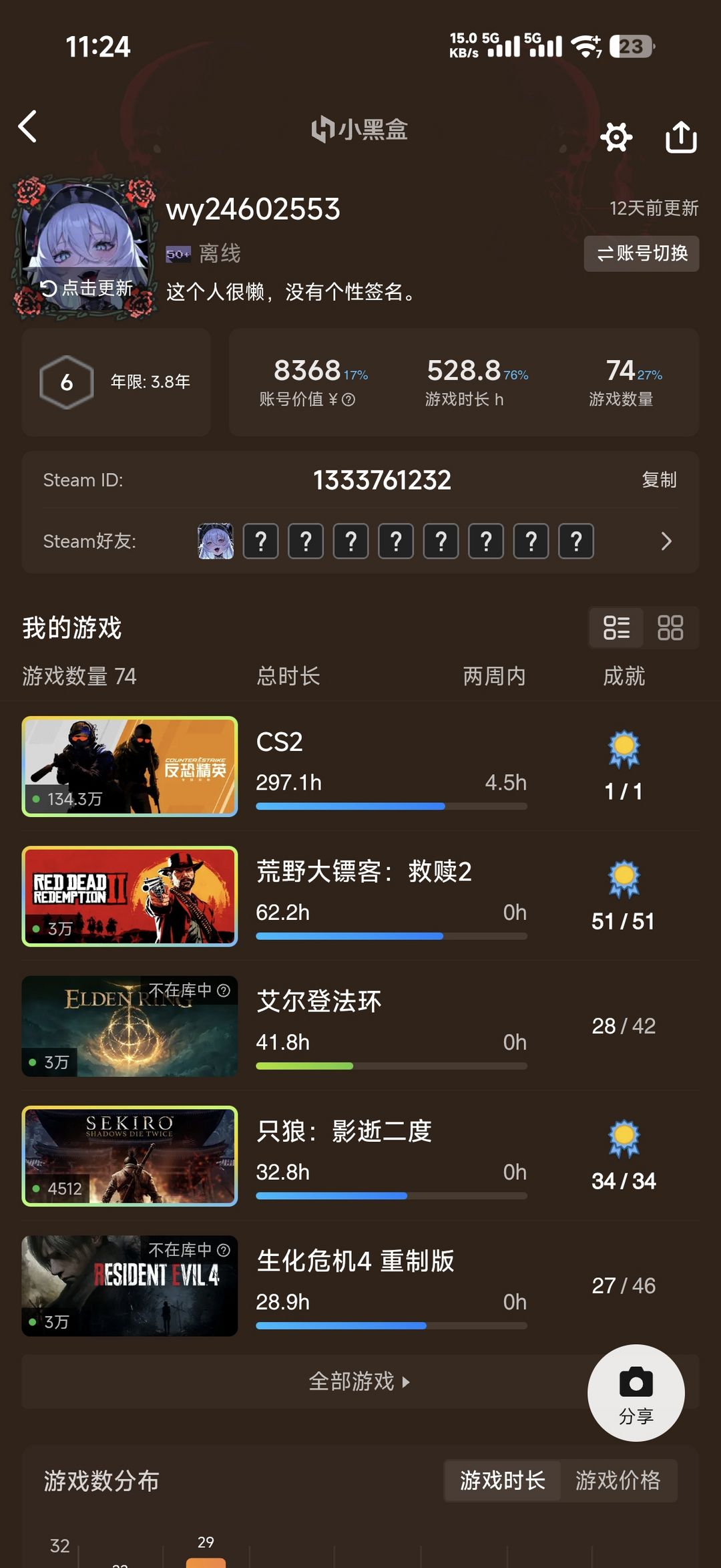 装备描述:本账号为国区,和自己的港区账号有家庭共享,一共178款游戏,热门游戏基本都有,明末,生化危机系列,大镖客2,黑猴,剑星,黑手党,森林,森林之子,法环,战地,求生之路,巫师,王国,文明,帝国时代等等