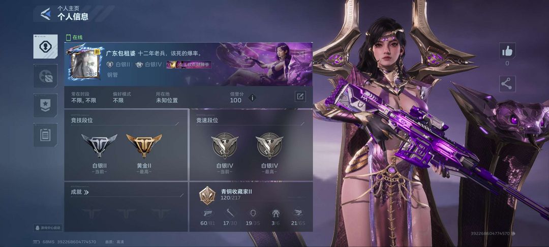 装备描述:禁止利用账号进行开挂、使用辅助违规软件诈骗等违规操作。毁号行为涉及毁坏虚拟财产罪及计算机安全罪,请文明游戏素质游戏,让我们共建美好租号平台!喜欢本账号请点 ☆收藏☆ 方便下次租用,谢谢光临惠顾!