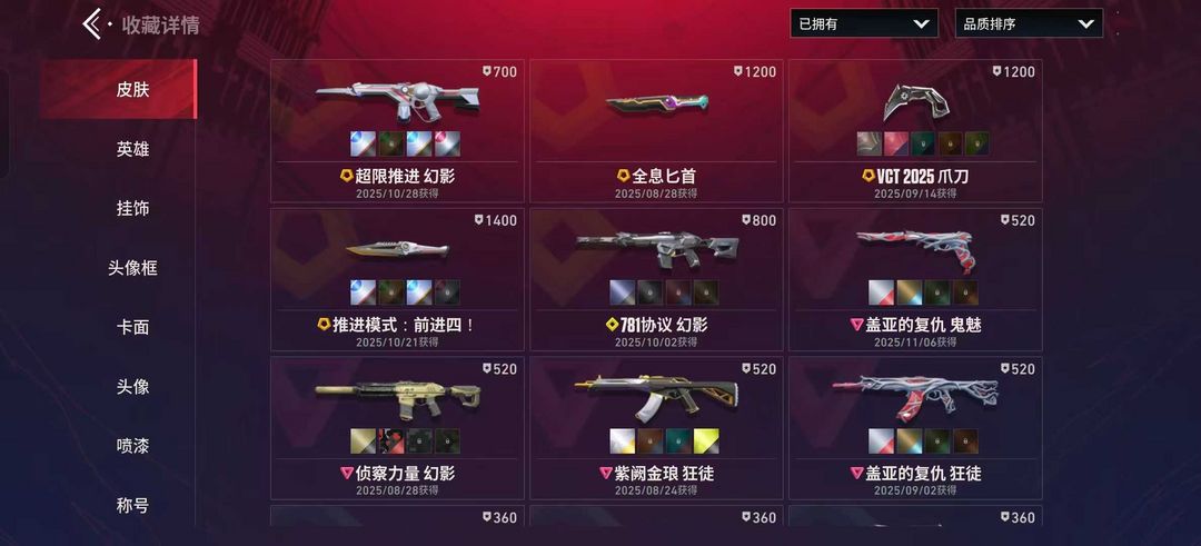 限制: 租号6次及以上 | 撤单率<40%才可租用此帐号装备描述:23级收藏家 满阶VCT2025爪刀 全息匕首推进模式:前进四! 超限推进幻影