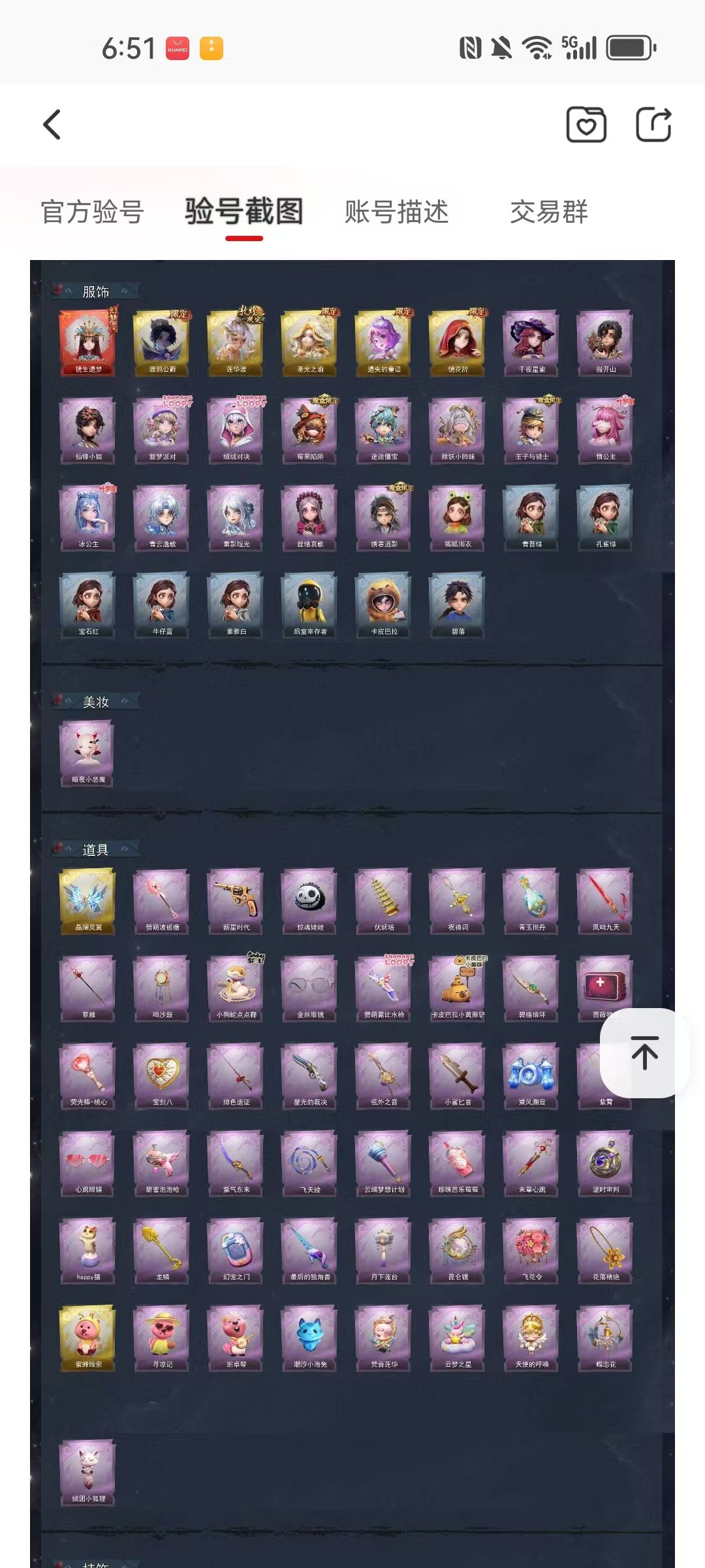 装备描述:【金色皮肤】零-渡鸦公爵、逍遥-莲华渡、薇薇安-圣光之谕、小黄-遗失的童话、巫铃儿-镜花辞3金4金 【紫色皮肤】兰-千夜星谕、零-搬开山、薇薇安-仙锋小姐、爱丽丝-甜梦派对、艾伦-绒绒对决、莉莉-莓果陷阱、阿念-迷途僵宝、莉莉-除妖小师妹、阿念-王子与骑士、莉莉-情公主、爱丽丝-冰公主、零-青云逸歌、巫铃儿-素影瑶光、爱丽丝-丝缕哀歌、逍遥-绣春逍影、小黄-呱呱雨衣 【道具皮肤】喷气背包-晶澜灵翼、铲子-赞萌波板糖、转轮手枪-新星时代、腰包-惊魂娃娃、葫芦-伏妖塔、摸金符-祝祷词、黄牛能量饮料-青玉抱丹、桃木剑-凤鸣九天、音响-鸣沙鼓、长鞭-小狗蛇点点鞭、夜视仪-金丝眼镜、短管猎枪-赞萌露比水枪、铲子-卡皮巴拉小黄豚铲、刺刀-碧络琅环、急救包-蔷薇物语、腰包-宝剑八、桃木剑-绯色遗证、短管猎枪-星光的裁决、除颤仪-弦外之音、刺刀-小鲨匕首、喷气背包-乘风溯雪、摸金符-紫霄、夜视仪-心跳眼镜、电击枪-甜蜜泡泡枪、刺刀-紫气东来、长鞭-飞天绫、专业手电-云端梦想计划 【美妆】暗夜小恶魔 【载具】惊奇万圣涂装