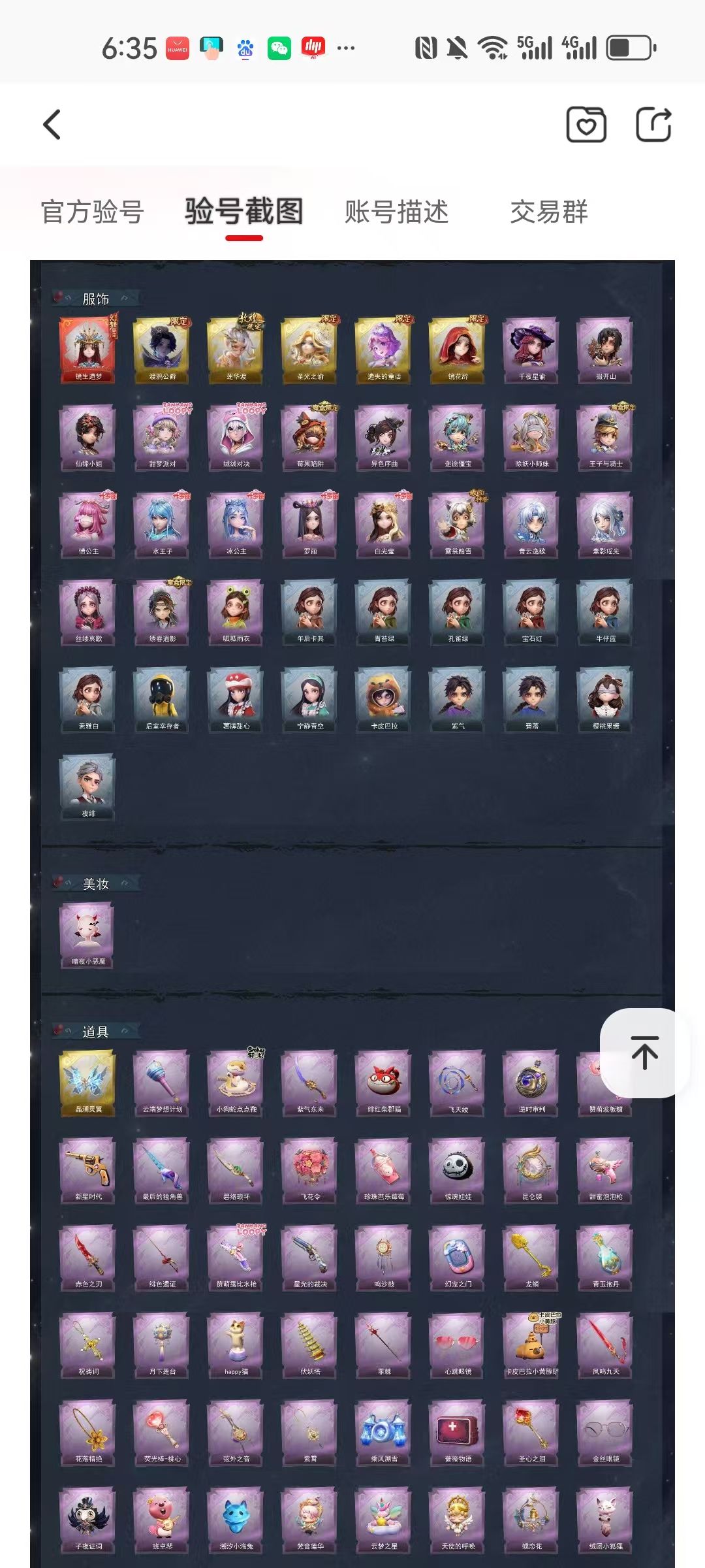 装备描述:【幻梦皮肤】巫铃儿-镜生遗梦 【金色皮肤】零-渡鸦公爵、逍遥-莲华渡、薇薇安-圣光之谕、小黄-遗失的童话、巫铃儿-镜花辞 【紫色皮肤】薇薇安-仙锋小姐、爱丽丝-甜梦派对、艾伦-绒绒对决、莉莉-莓果陷阱、莉莉-除妖小师妹、薇薇安-黑月挽歌、阿念-王子与骑士、莉莉-情公主、艾伦-水王子、爱丽丝-冰公主、逍遥-泽引山海、零-青云逸歌、爱丽丝-丝缕哀歌、逍遥-绣春逍影、小黄-呱呱雨衣 【道具皮肤】喷气背包-晶澜灵翼、除颤仪-弦外之音、转轮手枪-新星时代、腰包-月下莲台、铲子-卡皮巴拉小黄豚铲、葫芦-伏妖塔、长鞭-小狗蛇点点鞭、摸金符-花落精绝、刺刀-小鲨匕首、传送按钮-昆仑镜、短管猎枪-星光的裁决、传送按钮-逆时审判、喷气背包-乘风溯雪、桃木剑-永眠曲、传送按钮-幻宠之门、音响-鸣沙鼓、短管猎枪-赞萌露比水枪、腰包-宝剑八、夜视仪-金丝眼镜、长鞭-飞天绫、急救包-蔷薇物语、黄牛能量饮料-珍珠芭乐莓莓、电击枪-甜蜜泡泡枪、刺刀-碧络琅环、铲子-龙鳞、桃木剑-凤鸣九天、刺刀-紫气东来、专业手电-云端梦想计划、黄牛能量饮料-青玉抱丹、腰包-惊魂娃娃 【美妆】暗夜小恶魔 【载具】惊奇万圣涂装