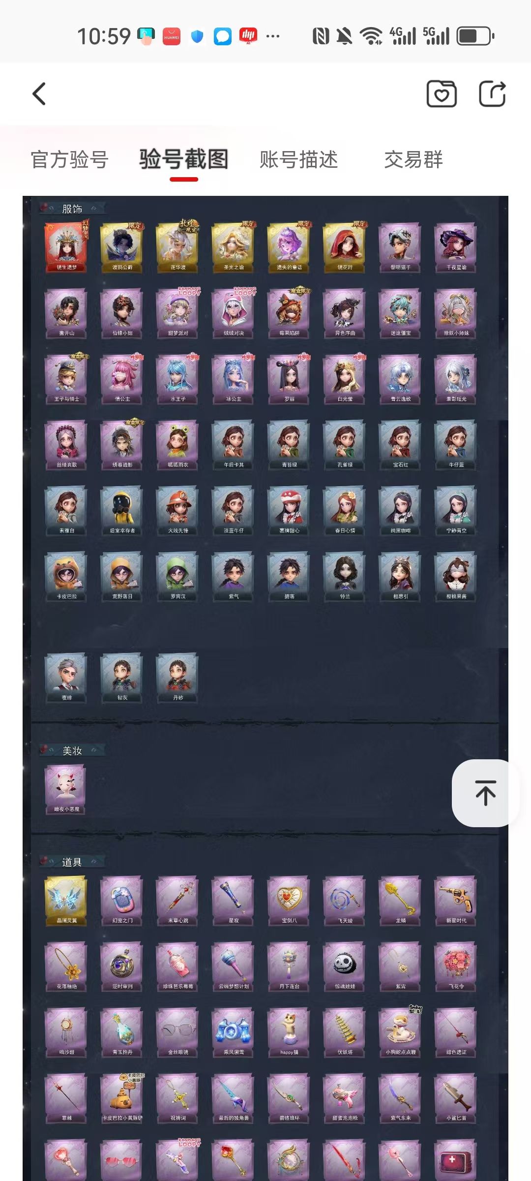 装备描述:【幻梦皮肤】巫铃儿-镜生遗梦 【金色皮肤】零-渡鸦公爵、逍遥-莲华渡、薇薇安-圣光之谕、小黄-遗失的童话、巫铃儿-镜花辞 【紫色皮肤】艾伦-黎明猎手、兰-千夜星谕、零-搬开山、薇薇安-仙锋小姐、爱丽丝-甜梦派对、艾伦-绒绒对决、莉莉-莓果陷阱、小黄-异色序曲、阿念-迷途僵宝、莉莉-除妖小师妹、阿念-王子与骑士、莉莉-情公主、艾伦-水王子、爱丽丝-冰公主、小黄-罗丽、薇薇安-白光莹、零-青云逸歌、巫铃儿-素影瑶光、爱丽丝-丝缕哀歌、逍遥-绣春逍影、小黄-呱呱雨衣 【道具皮肤】喷气背包-晶澜灵翼、传送按钮-幻宠之门、急救包-末章心跳、专业手电-星寂、腰包-宝剑八、长鞭-飞天绫、铲子-龙鳞、转轮手枪-新星时代、摸金符-花落精绝、传送按钮-逆时审判、黄牛能量饮料-珍珠芭乐莓莓、专业手电-云端梦想计划、腰包-月下莲台、腰包-惊魂娃娃、摸金符-紫霄、额外的背包-飞花令、音响-鸣沙鼓、黄牛能量饮料-青玉抱丹、夜视仪-金丝眼镜、喷气背包-乘风溯雪、音响-happy猫、葫芦-伏妖塔、长鞭-小狗蛇点点鞭、短管猎枪-赞萌露比水枪 【美妆】暗夜小恶魔 【载具】惊奇万圣涂装