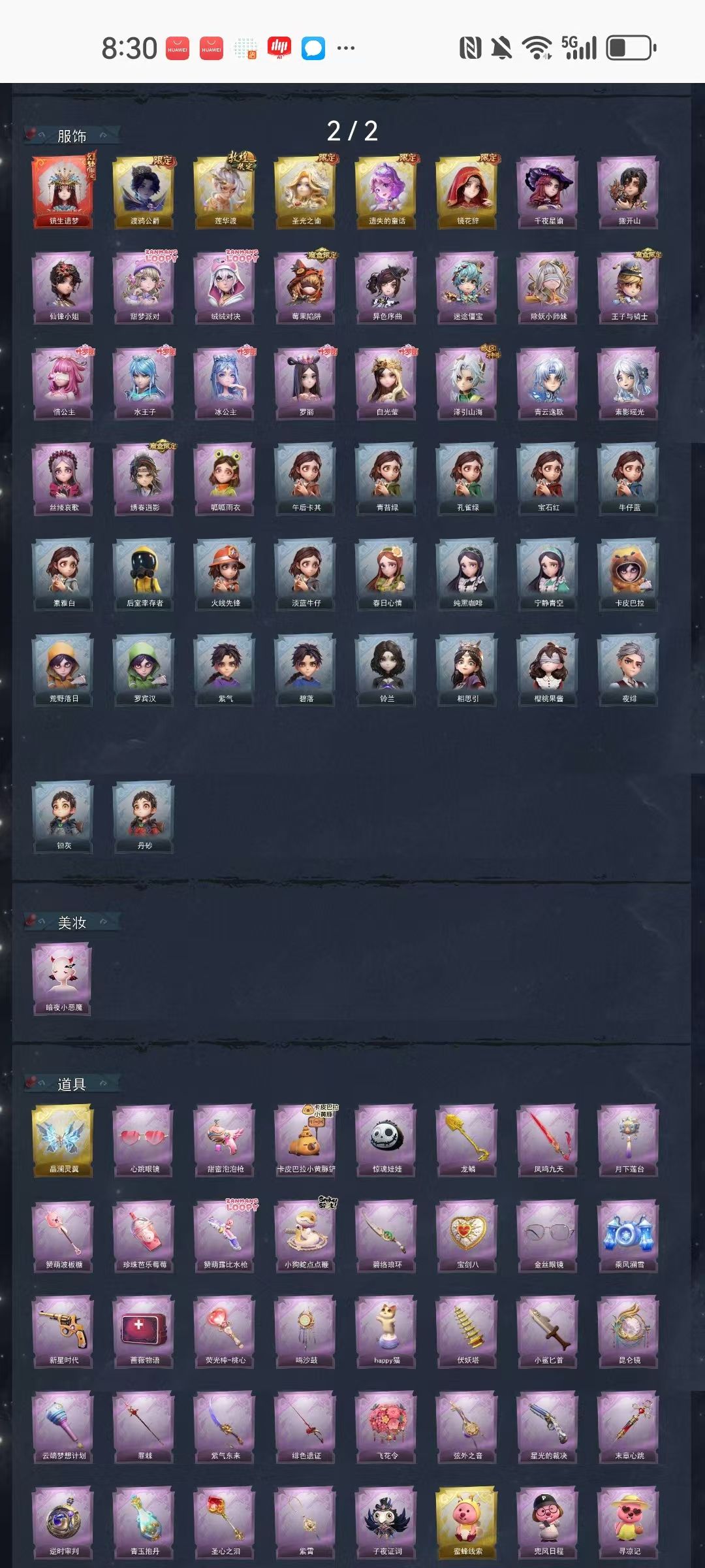装备描述:【幻梦皮肤】巫铃儿-镜生遗梦 【金色皮肤】零-渡鸦公爵、逍遥-莲华渡、薇薇安-圣光之谕、小黄-遗失的童话、巫铃儿-镜花辞 【紫色皮肤】兰-千夜星谕、零-搬开山、薇薇安-仙锋小姐、爱丽丝-甜梦派对、艾伦-绒绒对决、莉莉-莓果陷阱、小黄-异色序曲、阿念-迷途僵宝、莉莉-除妖小师妹、阿念-王子与骑士、莉莉-情公主、艾伦-水王子、爱丽丝-冰公主、小黄-罗丽、薇薇安-白光莹、逍遥-泽引山海、零-青云逸歌、巫铃儿-素影瑶光、爱丽丝-丝缕哀歌、逍遥-绣春逍影、小黄-呱呱雨衣 【道具皮肤】喷气背包-晶澜灵翼、夜视仪-心跳眼镜、电击枪-甜蜜泡泡枪、铲子-卡皮巴拉小黄豚铲、腰包-惊魂娃娃、铲子-龙鳞、桃木剑-凤鸣九天 【美妆】暗夜小恶魔 【载具】惊奇万圣涂装