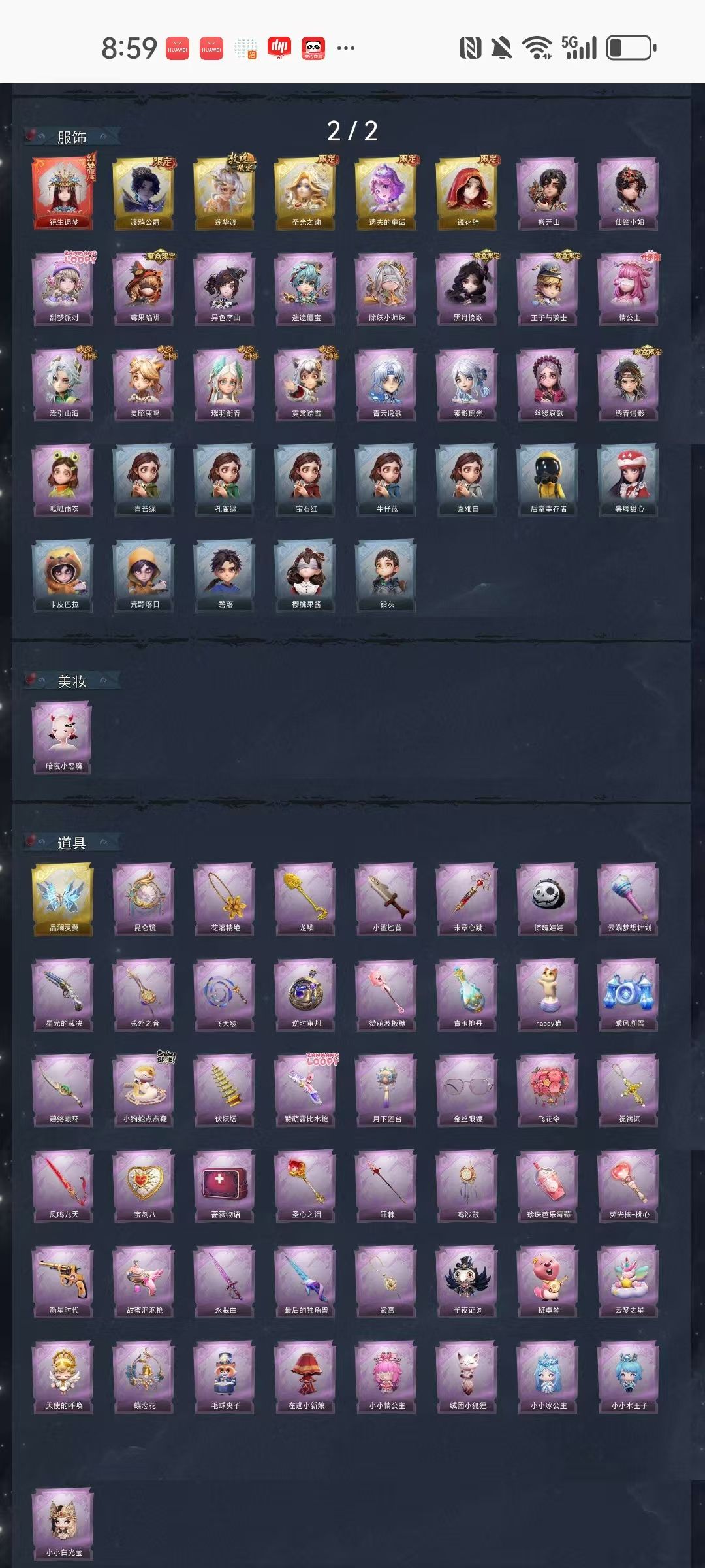 装备描述:【幻梦皮肤】巫铃儿-镜生遗梦 【金色皮肤】零-渡鸦公爵、逍遥-莲华渡、薇薇安-圣光之谕、小黄-遗失的童话、巫铃儿-镜花辞 【紫色皮肤】零-搬开山、薇薇安-仙锋小姐、爱丽丝-甜梦派对、莉莉-莓果陷阱、小黄-异色序曲、阿念-迷途僵宝、莉莉-除妖小师妹、薇薇安-黑月挽歌、阿念-王子与骑士、莉莉-情公主、逍遥-泽引山海、阿念-灵昭鹿鸣、爱丽丝-瑞羽衔春、小黄-霓裳踏雪、零-青云逸歌、巫铃儿-素影瑶光、爱丽丝-丝缕哀歌、逍遥-绣春逍影、小黄-呱呱雨衣 【道具皮肤】喷气背包-晶澜灵翼、传送按钮-昆仑镜、摸金符-花落精绝、铲子-龙鳞、刺刀-小鲨匕首、急救包-末章心跳、腰包-惊魂娃娃、专业手电-云端梦想计划、短管猎枪-星光的裁决、除颤仪-弦外之音、长鞭-飞天绫、传送按钮-逆时审判 【美妆】暗夜小恶魔 【载具】惊奇万圣涂装