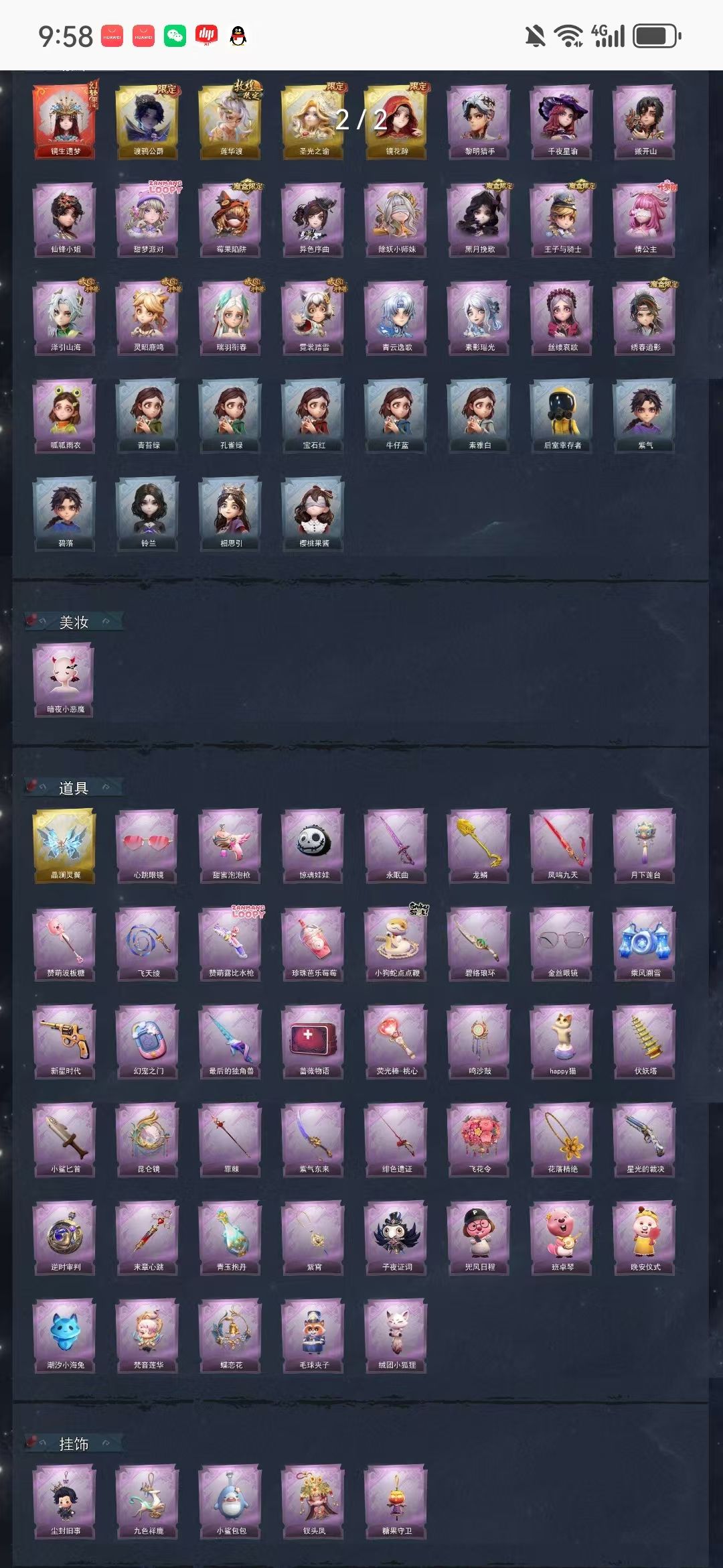 装备描述:【幻梦皮肤】巫铃儿-镜生遗梦3金 【金色皮肤】零-渡鸦公爵、逍遥-莲华渡、薇薇安-圣光之谕、巫铃儿-镜花辞 【紫色皮肤】艾伦-黎明猎手、兰-千夜星谕、零-搬开山、薇薇安-仙锋小姐、爱丽丝-甜梦派对、莉莉-莓果陷阱、小黄-异色序曲、莉莉-除妖小师妹、薇薇安-黑月挽歌、阿念-王子与骑士、莉莉-情公主、逍遥-泽引山海、阿念-灵昭鹿鸣、爱丽丝-瑞羽衔春、小黄-霓裳踏雪、零-青云逸歌、巫铃儿-素影瑶光、爱丽丝-丝缕哀歌、逍遥-绣春逍影、小黄-呱呱雨衣 【道具皮肤】喷气背包-晶澜灵翼、夜视仪-心跳眼镜、电击枪-甜蜜泡泡枪、腰包-惊魂娃娃、桃木剑-永眠曲、铲子-龙鳞、桃木剑-凤鸣九天、腰包-月下莲台、铲子-赞萌波板糖、长鞭-飞天绫、短管猎枪-赞萌露比水枪、黄牛能量饮料-珍珠芭乐莓莓、长鞭-小狗蛇点点鞭、刺刀-碧络琅环、夜视仪-金丝眼镜、喷气背包-乘风溯雪、转轮手枪-新星时代、传送按钮-幻宠之门、桃木剑-最后的独角兽、急救包-蔷薇物语、音响-鸣沙鼓、音响-happy猫、葫芦-伏妖塔、刺刀-小鲨匕首、传送按钮-昆仑镜、额外的背包-飞花令、摸金符-花落精绝 【美妆】暗夜小恶魔 【载具】惊奇万圣涂装