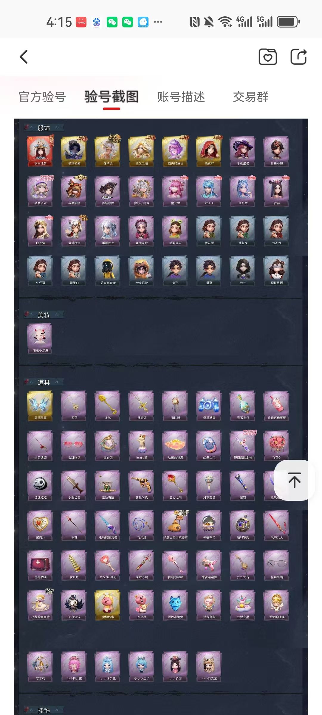 装备描述:【幻梦皮肤】巫铃儿-镜生遗梦 【金色皮肤】零-渡鸦公爵、逍遥-莲华渡、薇薇安-圣光之谕、小黄-遗失的童话、巫铃儿-镜花辞 【紫色皮肤】兰-千夜星谕、薇薇安-仙锋小姐、爱丽丝-甜梦派对、莉莉-莓果陷阱、小黄-异色序曲、莉莉-除妖小师妹、莉莉-情公主、艾伦-水王子、爱丽丝-冰公主、小黄-罗丽、薇薇安-白光莹、小黄-霓裳踏雪、巫铃儿-素影瑶光、爱丽丝-丝缕哀歌、小黄-呱呱雨衣 【道具皮肤】喷气背包-晶澜灵翼、摸金符-紫霄、铲子-龙鳞、摸金符-祝祷词、音响-鸣沙鼓、喷气背包-乘风溯雪、黄牛能量饮料-青玉抱丹、黄牛能量饮料-珍珠芭乐莓莓、桃木剑-绯色遗证、夜视仪-心跳眼镜、传送按钮-昆仑镜、音响-happy猫、腰包-私藏的银河、传送按钮-幻宠之门、短管猎枪-赞萌露比水枪、额外的背包-飞花令、腰包-惊魂娃娃、刺刀-小鲨匕首、黄牛能量饮料-雪顶奇愿、转轮手枪-新星时代、铲子-圣心之泪、腰包-月下莲台、专业手电-星寂、刺刀-紫气东来、腰包-宝剑八、桃木剑-最后的独角兽、长鞭-飞天绫、铲子-卡皮巴拉小黄豚铲、音响-冬夜暖忆、传送按钮-逆时审判【美妆】暗夜小恶魔 【载具】惊奇万圣涂装