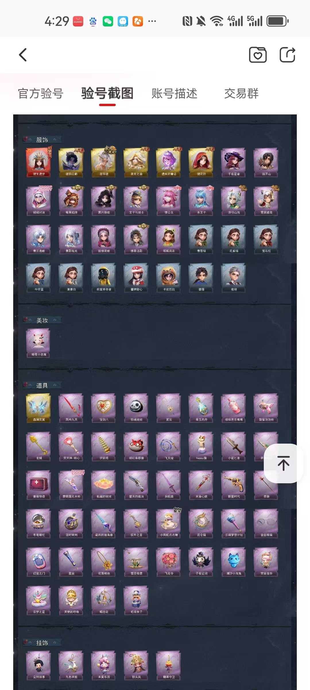 装备描述:【幻梦皮肤】巫铃儿镜生遗梦4金3金 【金色皮肤】零-渡鸦公爵、逍遥-莲华渡、薇薇安-圣光之谕、小黄-遗失的童话、巫铃儿-镜花辞 【紫色皮肤】兰-千夜星谕、零-搬开山、艾伦-绒绒对决、莉莉-莓果陷阱、薇薇安-黑月挽歌、阿念-王子与骑士、莉莉-情公主、艾伦-水王子、逍遥-泽引山海、小黄-霓裳踏雪、零-青云逸歌、巫铃儿-素影瑶光、爱丽丝-丝缕哀歌、逍遥-绣春逍影、小黄-呱呱雨衣 【道具皮肤】喷气背包-晶澜灵翼、桃木剑-凤鸣九天、腰包-宝剑八、腰包-惊魂娃娃、摸金符-紫霄、黄牛能量饮料-青玉抱丹、黄牛能量饮料-珍珠芭乐莓莓、电击枪-甜蜜泡泡枪、铲子-龙鳞、葫芦-伏妖塔、腰包-绯红柴郡猫、长鞭-飞天绫、音响-happy猫、刺刀-小鲨匕首、刺刀-碧络琅环、急救包-蔷薇物语、短管猎枪-赞萌露比水枪、腰包-私藏的银河、短管猎枪-星光的裁决、桃木剑-永眠曲、急救包-末章心跳、转轮手枪-新星时代、音响-冬夜暖忆、传送按钮-逆时审判、桃木剑-最后的独角兽、除颤仪-弦外之音、长鞭-小狗蛇点点鞭、传送按钮-昆仑镜、专业手电-云端梦想计划、夜视仪-金丝眼镜、传送按钮-幻宠之门【美妆】暗夜小恶魔【载具】惊奇万圣涂装