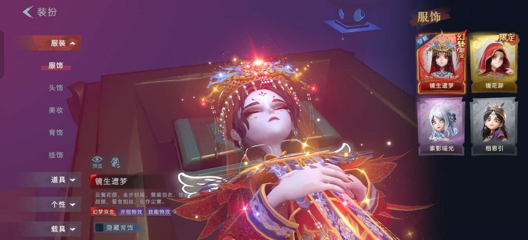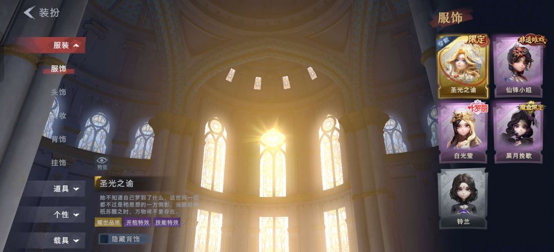 装备描述:红皮2;金皮5;紫皮26;道具皮44;皮肤:小黄-炽天使,巫铃儿-镜生遗梦,逍遥-莲华渡,零-渡鸦公爵,巫铃儿-镜花辞,薇薇安-圣光之谕,小黄-遗失的童话,莉莉-情公主,阿念-灵昭鹿鸣,薇薇安-黑月挽歌,零-青云逸歌,艾伦-水王子,爱丽丝-瑞羽衔春,小黄-异色序曲,莉莉-除妖小师妹,小黄-霓裳踏雪,爱丽丝-冰公主,艾伦-黎明猎手,莉莉-莓果陷阱,薇薇安-仙锋小姐,逍遥-绣春逍影,爱丽丝-丝缕哀歌,零-搬开山,小黄-呱呱雨衣,薇薇安-白光莹,小黄-罗丽,巫铃儿-素影瑶光,艾伦-绒绒对决,兰-千夜星谕,爱丽丝-甜梦派对,逍遥-泽引山海,阿念-王子与骑士,阿念-迷途僵宝;道具:喷气背包-晶澜灵翼,专业手电-云端梦想计划,摸金符-祝祷词,长鞭-飞天绫,夜视仪-金丝眼镜,额外的背包-飞花令,急救包-土拨鼠捏捏,铲子-龙鳞,铲子-卡皮巴拉小黄豚铲,夜视仪-心跳眼镜,音响-happy猫,音响-冬夜暖忆,黄牛能量饮料-雪顶奇愿,专业手电-星寂,急救包-末章心跳,急救包-蔷薇物语,短管猎枪-赞萌露比水枪,刺刀-紫气东来,传送按钮-幻宠之门,电击枪-甜蜜泡泡枪,桃木剑-最后的独角兽,腰包-私藏的银河