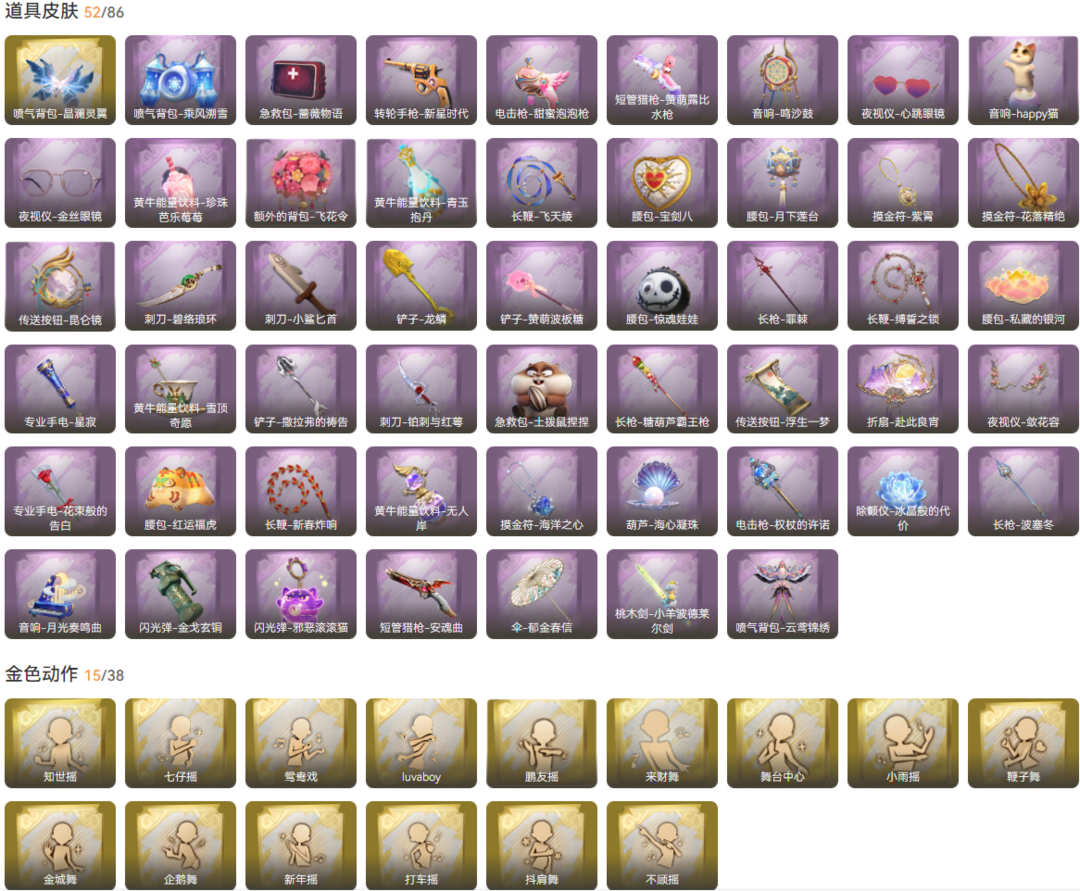 装备描述:7耀世 7金16紫2车 晶澜灵翼 剑仙 瑶台梦 海月息潮 渡鸦公爵 遗失的童话 莲华渡 镜花辞 绮想花园涂装载具 惊奇万圣涂装 小黄-呱呱雨衣、爱丽丝-丝缕哀歌、零-青云逸歌、逍遥-绣春逍影、莉莉-情公主、莉莉-除妖小师妹、莉莉-莓果陷阱、爱丽丝-甜梦派对、薇薇安-仙锋小姐、艾伦-黎明猎手、阿念-庆宴绮愿、爱丽丝-耀眼的你、巫铃儿-琢玉怀乡、爱德华-梵卓之礼、逍遥-万迭云华、小满-燕燕于飞 长枪-罪棘、腰包-惊魂娃娃、铲子-赞萌波板糖、铲子-龙鳞、刺刀-小鲨匕首、刺刀-碧络琅环、传送按钮-昆仑镜、摸金符-花落精绝、摸金符-紫霄、腰包-月下莲台、腰包-宝剑八、长鞭-飞天绫、黄牛能量饮料-青玉抱丹、额外的背包-飞花令、黄牛能量饮料-珍珠芭乐莓莓、夜视仪-金丝眼镜、音响-happy猫、夜视仪-心跳眼镜、音响-鸣沙鼓、喷气背包-晶澜灵翼、喷气背包-乘风溯雪、电击枪-甜蜜泡泡枪、转轮手枪-新星时代、急救包-蔷薇物语、短管猎枪-赞萌露比水枪、长鞭-缚誓之锁、专业手电-星寂、腰包-私藏的银河、黄牛能量饮料-雪顶奇愿、急救包-土拨鼠捏捏、刺刀-铂刺与红萼、铲子-撒拉弗的祷告、长枪-糖葫芦霸王枪、夜视仪