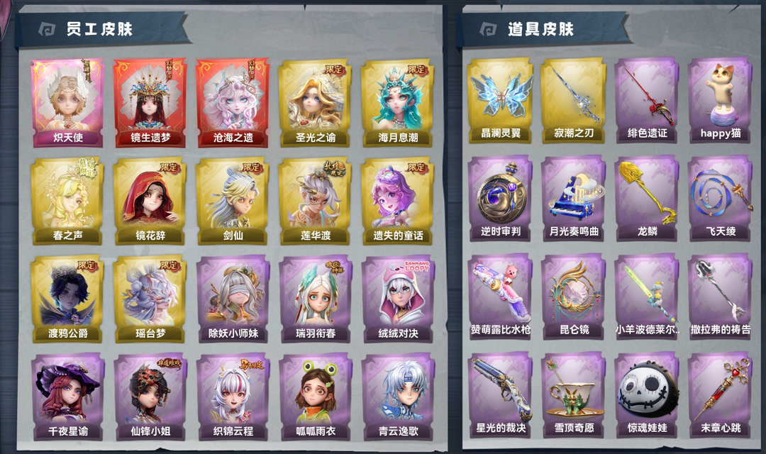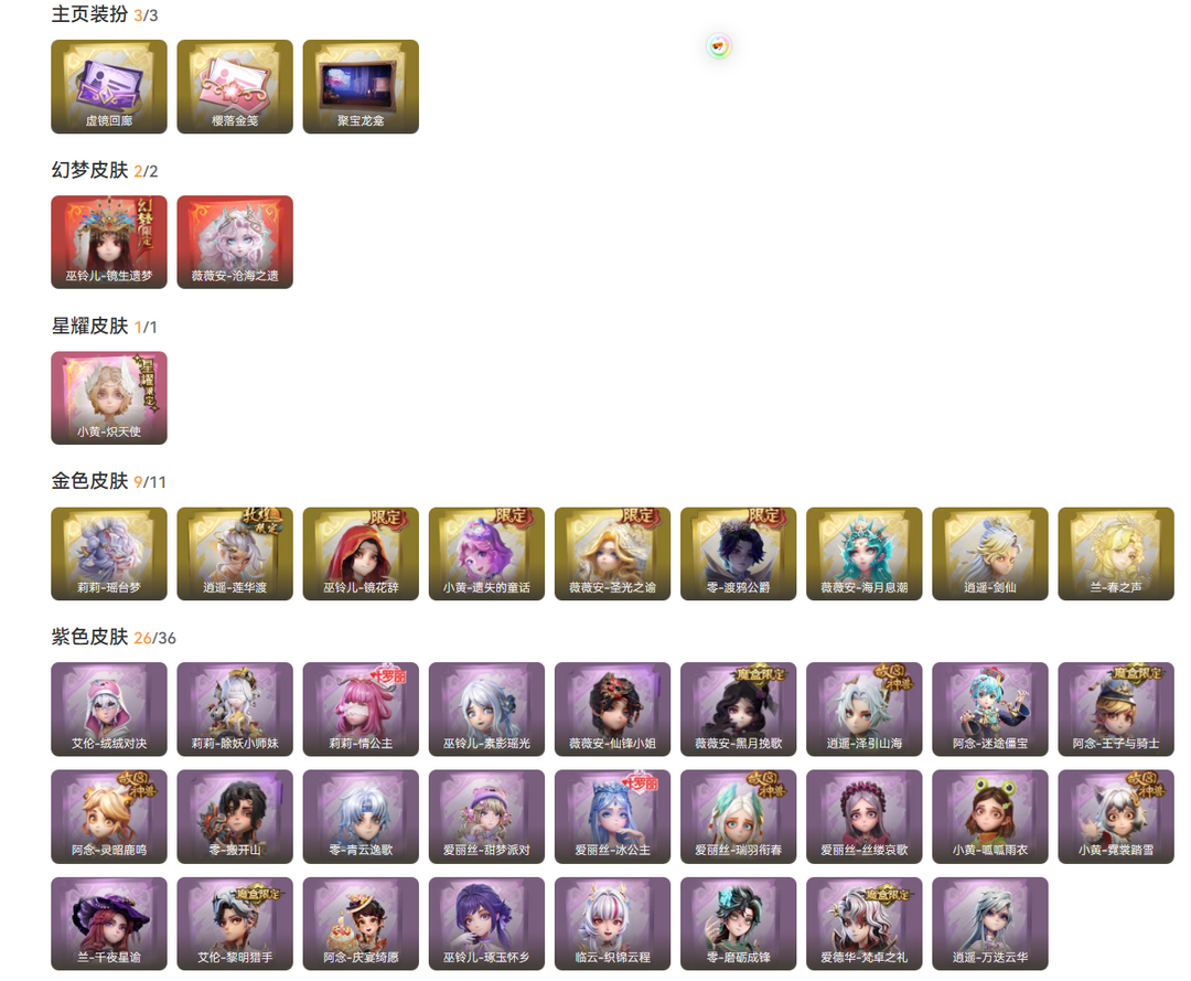 装备描述:2红1星耀9金29紫皮73道具皮肤56饰品 星耀皮肤 小黄-炽天使 幻梦皮肤 巫铃儿-镜生遗梦、薇薇安-沧海之遗 金色皮肤 薇薇安-圣光之谕、小黄-遗失的童话、巫铃儿-镜花辞、逍遥-莲华渡、零-渡鸦公爵、莉莉-瑶台梦、逍遥-剑仙、薇薇安-海月息潮、兰-春之声 紫色皮肤 小黄-霓裳踏雪、小黄-呱呱雨衣、爱丽丝-丝缕哀歌、爱丽丝-瑞羽衔春、爱丽丝-冰公主、零-青云逸歌、阿念-灵昭鹿鸣、阿念-王子与骑士、阿念-迷途僵宝、逍遥-泽引山海、薇薇安-黑月挽歌、巫铃儿-素影瑶光、莉莉-情公主、莉莉-除妖小师妹、艾伦-绒绒对决、爱丽丝-甜梦派对、薇薇安-仙锋小姐、零-搬开山、兰-千夜星谕、艾伦-黎明猎手、阿念-庆宴绮愿、零-磨砺成锋、临云-织锦云程、巫铃儿-琢玉怀乡、爱德华-梵卓之礼、逍遥-万迭云华 道具皮肤 腰包-惊魂娃娃、铲子-赞萌波板糖、铲子-龙鳞、铲子-圣心之泪、刺刀-紫气东来、刺刀-小鲨匕首、桃木剑-永眠曲、桃木剑-最后的独角兽、桃木剑-凤鸣九天、传送按钮-幻宠之门、传送按钮-昆仑镜、摸金符-花落精绝、摸金符-紫霄、腰包-月下莲台、腰包-宝剑八、短管猎枪-星光的裁决、专业手电-云端梦想计划、