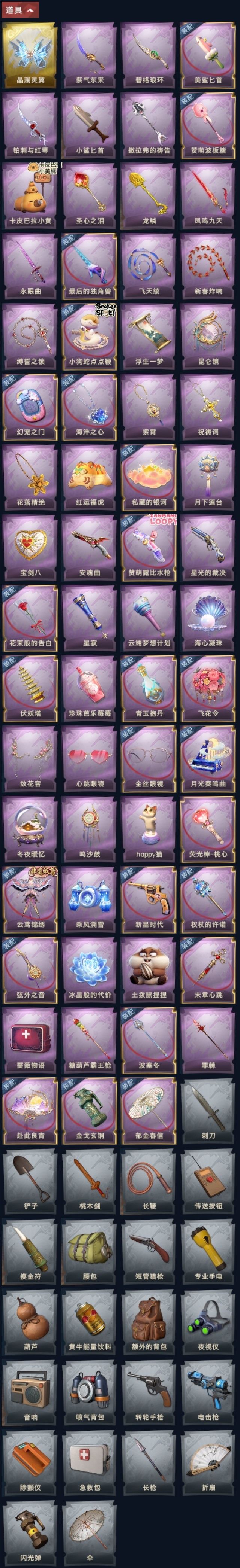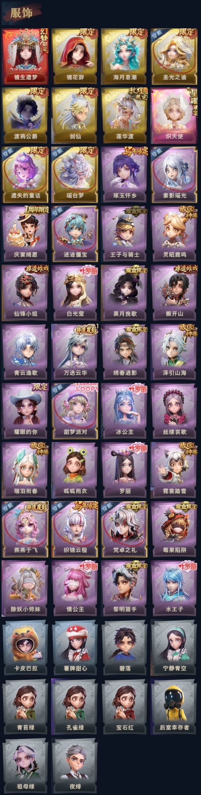 装备描述:红皮(幻梦):1 粉皮(星耀):1 金皮:8 紫皮:30 道具皮:62 幻梦皮肤:巫铃儿-镜生遗梦 星耀皮肤:小黄-炽天使 金色皮肤:小黄-遗失的童话,薇薇安-圣光之谕,巫铃儿-镜花辞,逍遥-莲华渡,零-渡鸦公爵,莉莉-瑶台梦,薇薇安-海月息潮,逍遥-剑仙 紫色皮肤:小黄-罗丽,小黄-霓裳踏雪,爱丽丝-丝缕哀歌,爱丽丝-瑞羽衔春,爱丽丝-冰公主,零-青云逸歌,阿念-灵昭鹿鸣,阿念-王子与骑士,逍遥-泽引山海,薇薇安-白光莹,薇薇安-黑月挽歌,巫铃儿-素影瑶光,莉莉-情公主,艾伦-水王子,小黄-呱呱雨衣,阿念-迷途僵宝,莉莉-除妖小师妹,逍遥-绣春逍影,莉莉-莓果陷阱,爱丽丝-甜梦派对,薇薇安-仙锋小姐,零-搬开山,艾伦-黎明猎手,爱丽丝-耀眼的你,阿念-庆宴绮愿,巫铃儿-琢玉怀乡,临云-织锦云程,爱德华-梵卓之礼,小满-燕燕于飞,逍遥-万迭云华 道具皮肤:铲子-龙鳞,铲子-圣心之泪,刺刀-小鲨匕首,桃木剑-永眠曲,桃木剑-最后的独角兽,传送按钮-幻宠之门,摸金符-祝祷词,摸金符-花落精绝,腰包-宝剑八,短管猎枪-星光的裁决,专业手电-云端梦想计划,长鞭-小狗蛇点点鞭,桃木剑-凤鸣九天,