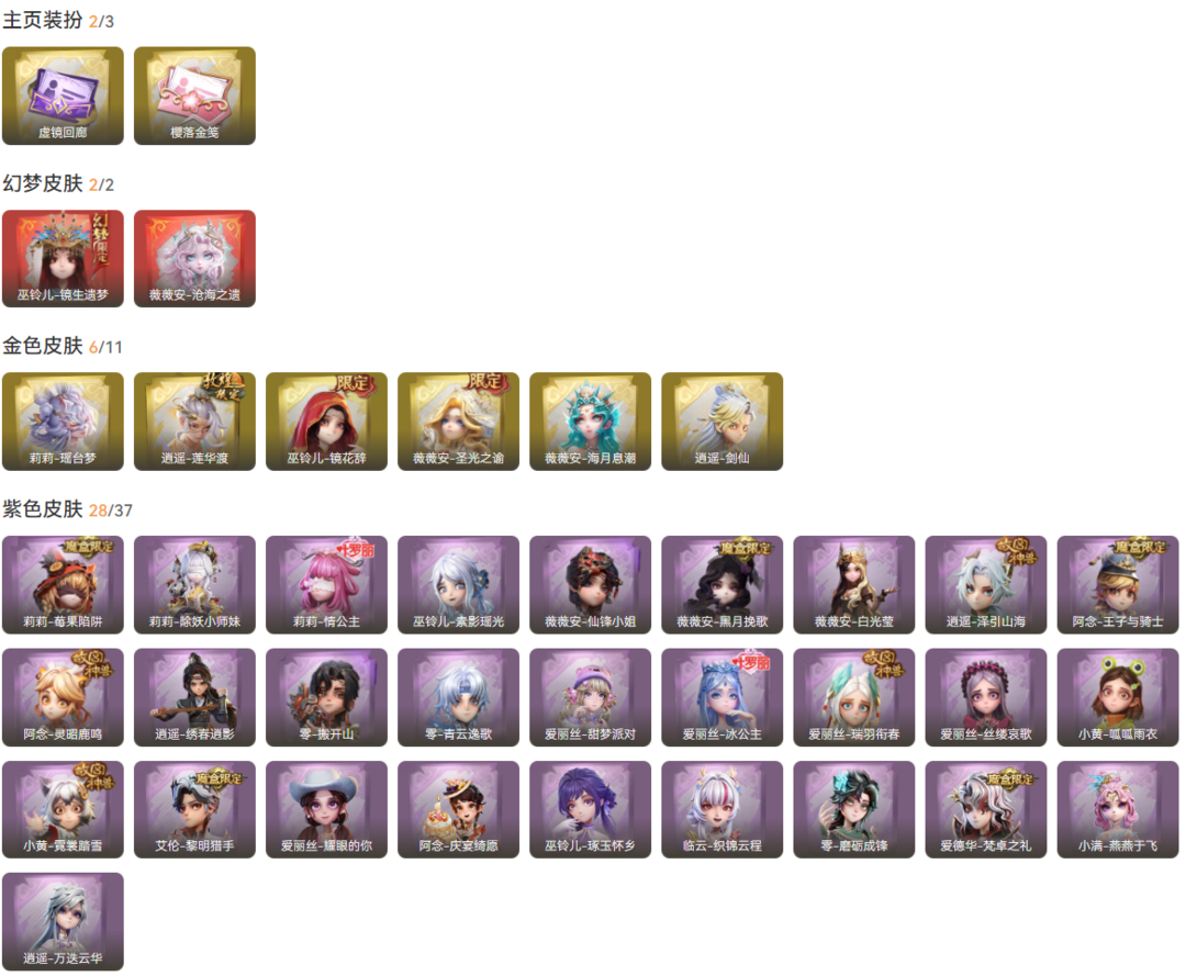 装备描述:2幻梦6耀世 2红6金28紫2车 保底有1红5金 晶澜灵翼 寂潮之刃 绮想花园涂装载具 惊奇万圣载具 沧海之遗 镜生遗梦 圣光之谕、巫铃儿-镜花辞、逍遥-莲华渡、莉莉-瑶台梦、逍遥-剑仙、薇薇安-海月息潮 小黄-霓裳踏雪、小黄-呱呱雨衣、爱丽丝-丝缕哀歌、爱丽丝-瑞羽衔春、爱丽丝-冰公主、零-青云逸歌、阿念-灵昭鹿鸣、阿念-王子与骑士、逍遥-泽引山海、逍遥-绣春逍影、薇薇安-白光莹、薇薇安-黑月挽歌、巫铃儿-素影瑶光、莉莉-情公主、莉莉-除妖小师妹、莉莉-莓果陷阱、爱丽丝-甜梦派对、薇薇安-仙锋小姐、零-搬开山、艾伦-黎明猎手、阿念-庆宴绮愿、爱丽丝-耀眼的你、零-磨砺成锋、临云-织锦云程、巫铃儿-琢玉怀乡、爱德华-梵卓之礼、逍遥-万迭云华、小满-燕燕于飞