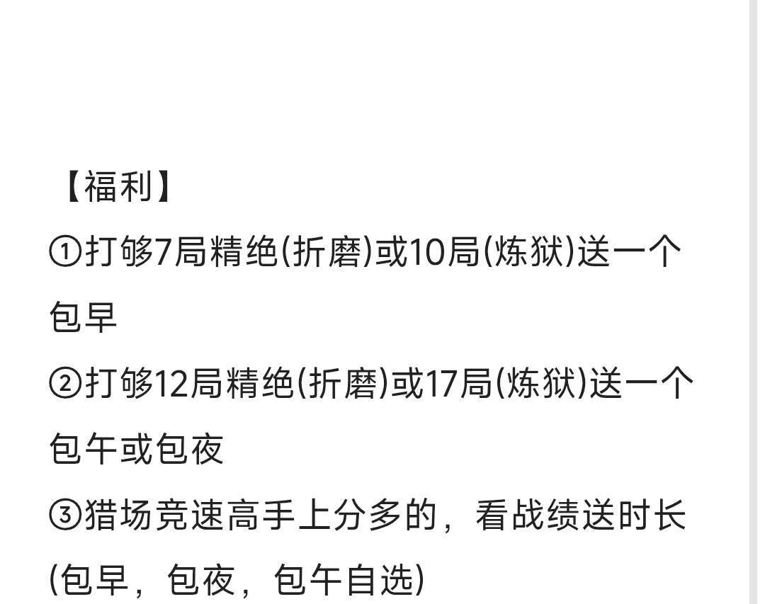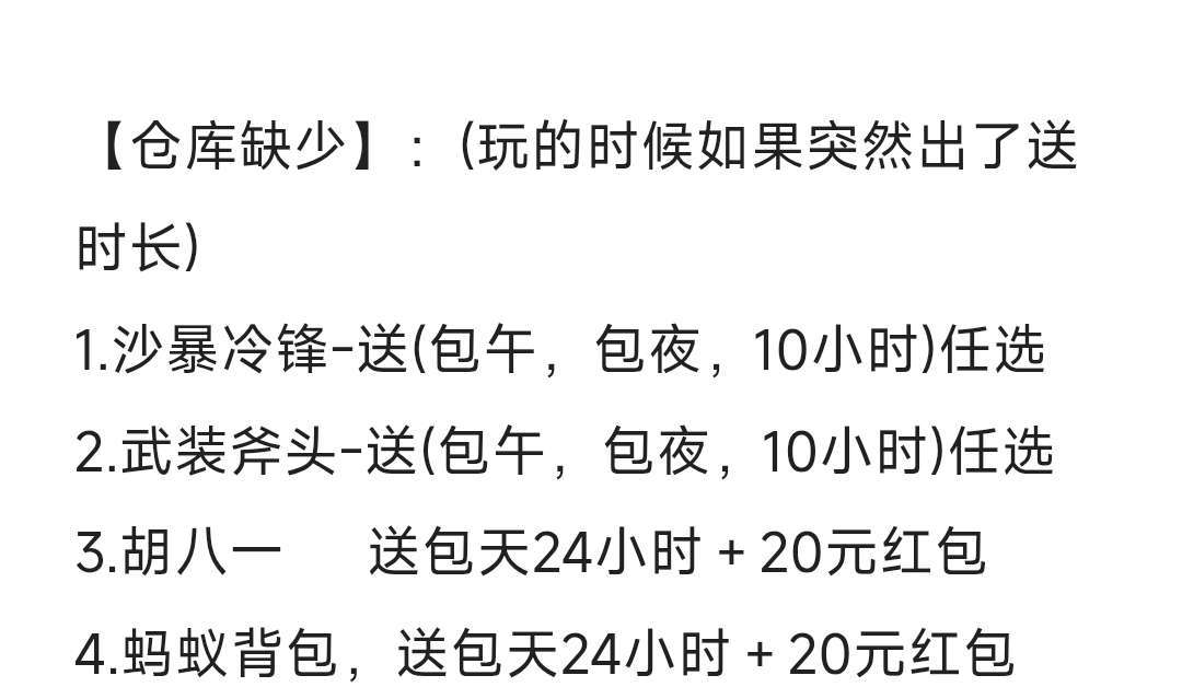 装备描述:(伞司午伞灵衣溜衣午巴)连西方式 【仓库缺少】:(玩的时候如果顺便出了送时长) 1.沙暴冷锋-送(包午,包夜,10小时)任选 2.武装斧头-送(包午,包夜,10小时)任选 3.胡八一 送包天24小时+26元红包 4.蚂蚁背包,送包天24小时+26元红包 【福利】 ①打够7局精绝(折磨)或10局(炼狱)送一个包早 ②打够12局精绝(折磨)或17局(炼狱)送一个包午或包夜 ③猎场竞速高手上分多的,看战绩送时长(包早,包夜,包午自选) 望知道: ①希望结束后评价一下,会随机看战绩送时长(伞司午伞灵衣溜衣午巴) ②手机上下单更便宜,然后再去电脑上玩