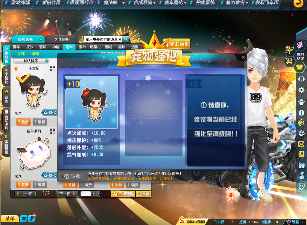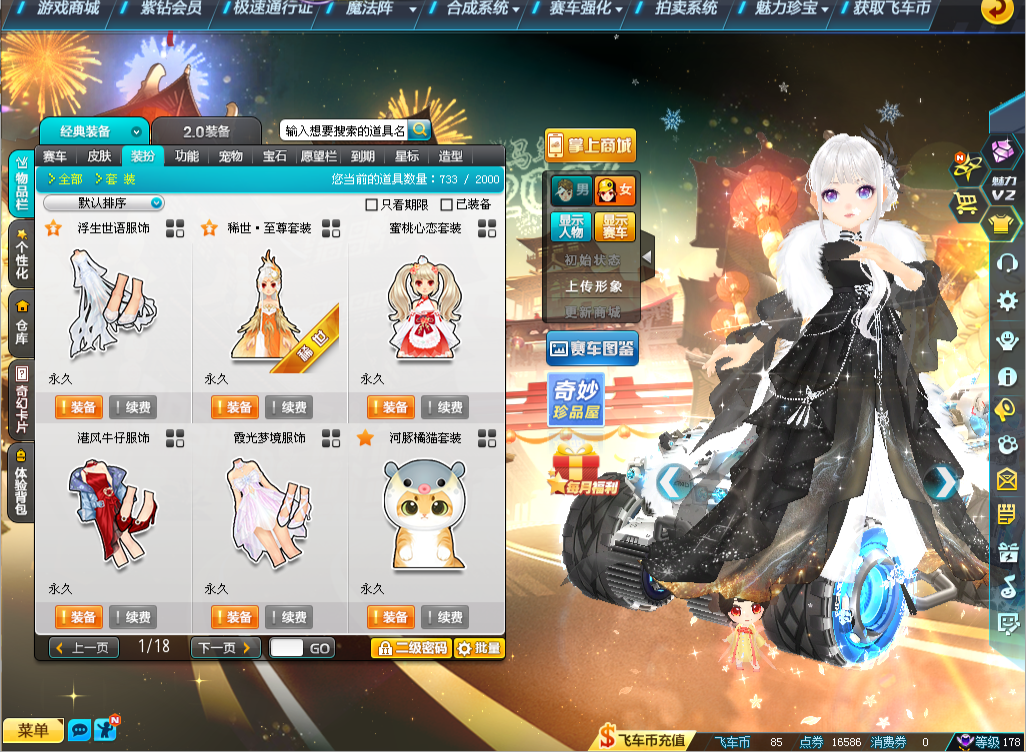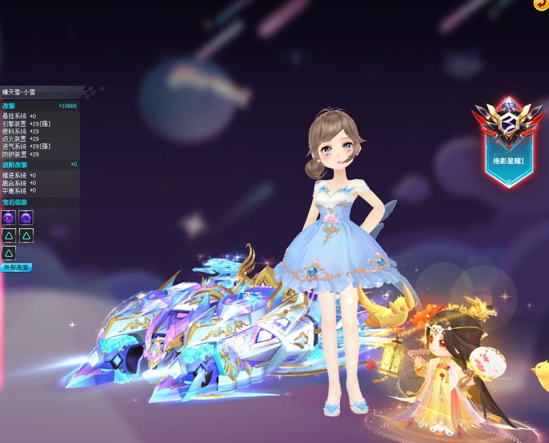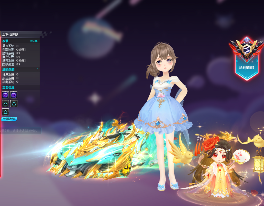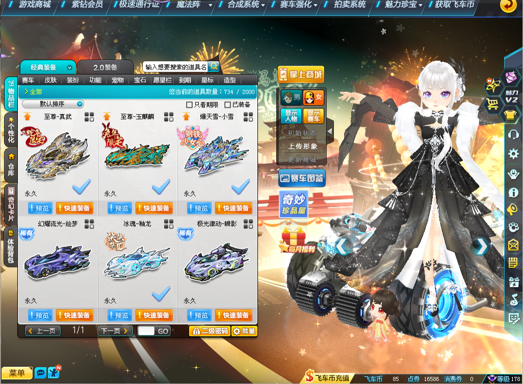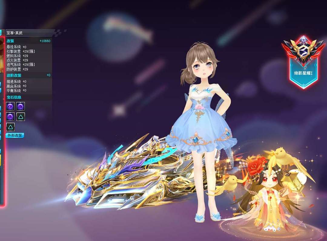 装备描述:S五项29竞速满4至尊玄冥-真武、五项29双4至尊玉麒麟、五项29双4爆天雪-小雪、五项29单4爆天雷诺、高改爆天甲Mini、赤道极光、龙胆逆鳞、异域使者、雷蛇,男套装8页、女套装18页(女稀世:至尊套装,男女悬浮:忆梦絮语/浮生世语/璀璨星芒),骑宠小贵妃强10
