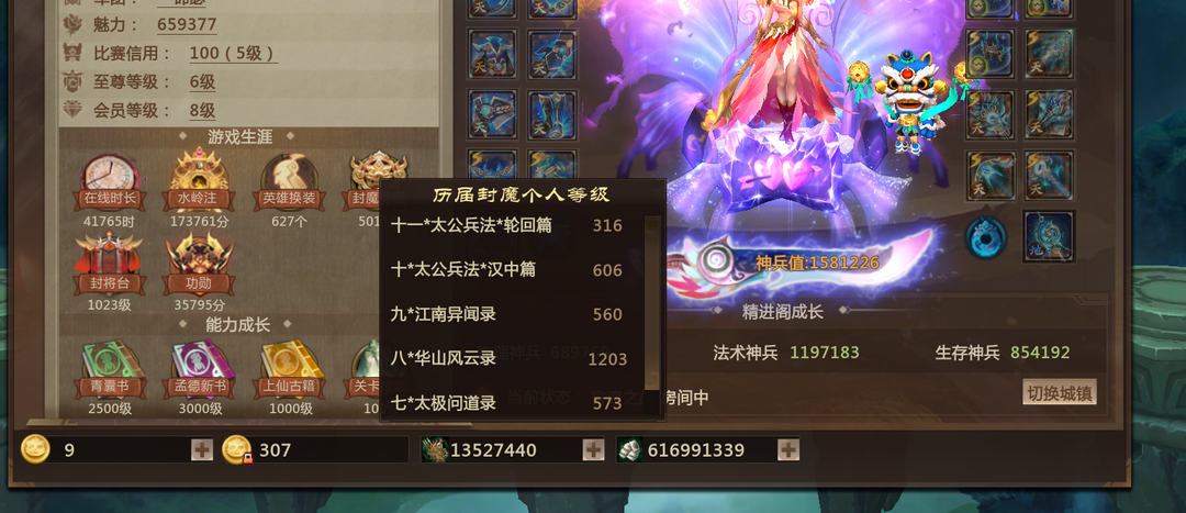 装备描述:官渡区158万神兵+1仙尊+4灵尊+双年少小乔马良+封魔316级+周年1万+新活动24层 1164爆伤 宠物狮子+龙子+鲲鹏+狐狸+鬼帅 皮肤627 天赋名望板正 众生相 星月 星灵 幻神 圣诞 30万魅力逃套 双二级翅膀坐骑 大圣 尊6 战力套 12章套装
