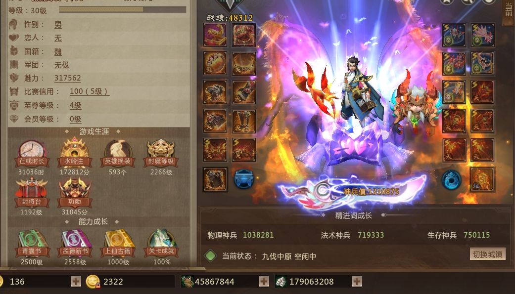 装备描述:尊四,131万神兵物理,31W魅力,1200破甲,593皮肤,年少韩当,彩金于禁,神鬼帝翅膀,神九尾,大圣翅膀,各种玩具,什么模式也能玩,出征体验不错