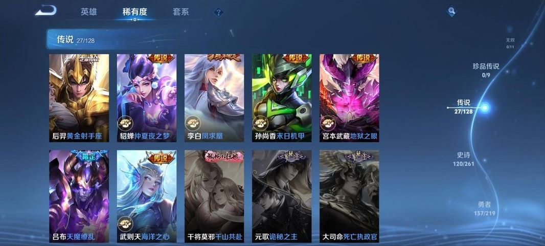 装备描述:贵族等级V10,英雄数量127,典藏皮肤数2,皮肤数量381,冰锋战神街头霸王天魔缭乱至尊宝王者之锤凤求凰逐梦之影神奇女侠黄金狮子座一生所爱大圣娶亲冰霜恋舞曲青龙志白虎志朱雀志太华久胜战神飞衡梁祝倪克斯神谕白鹤梁神女鸣剑·曳影龙胆李逍遥奔雷神使时雨天司