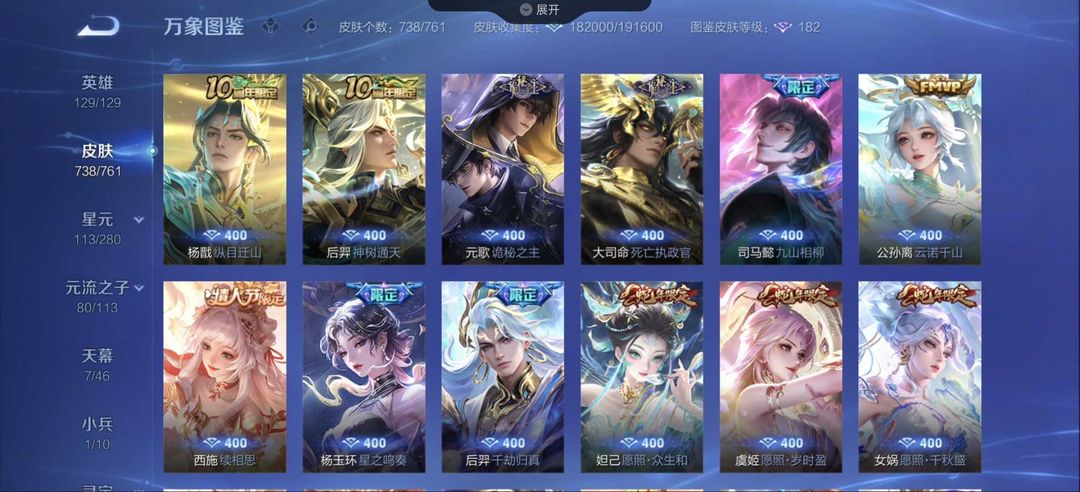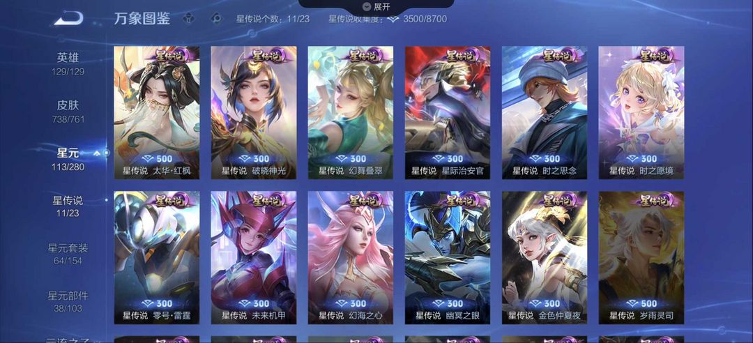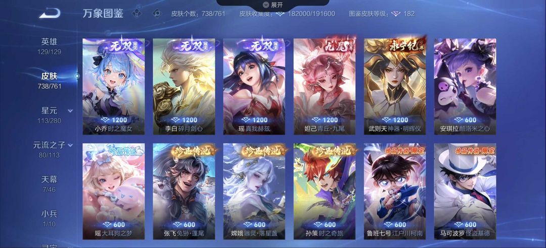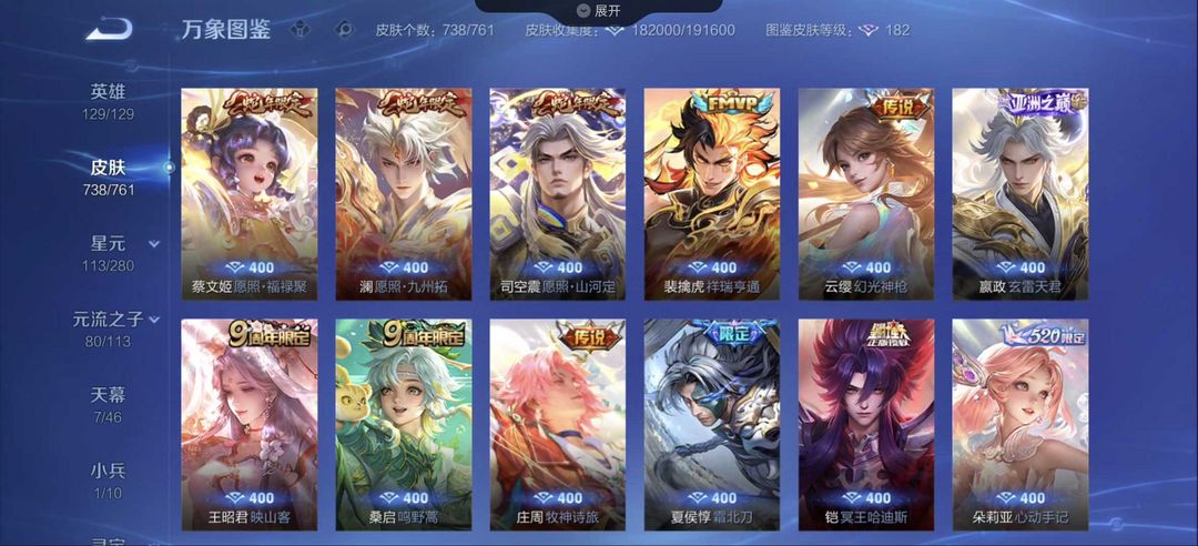 738皮肤无双贵十丶7天幕丶11星传说丶18典藏皮肤.129传说丶满珍品无双丶十无双丶7珍品传说