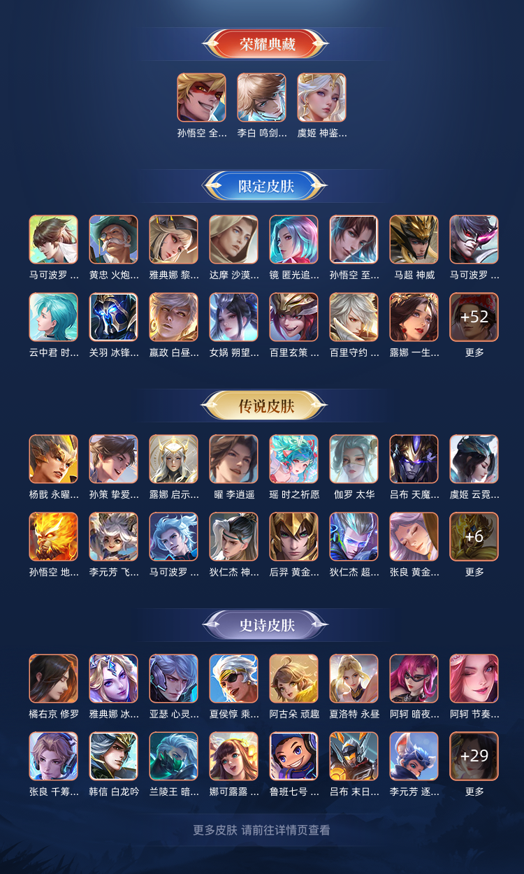 装备描述:371皮肤3典藏 30传说皮肤 111史诗皮肤 8年限皮 10生肖限定 省级老虎李信孙尚香 福段位星耀5 带妹爽号