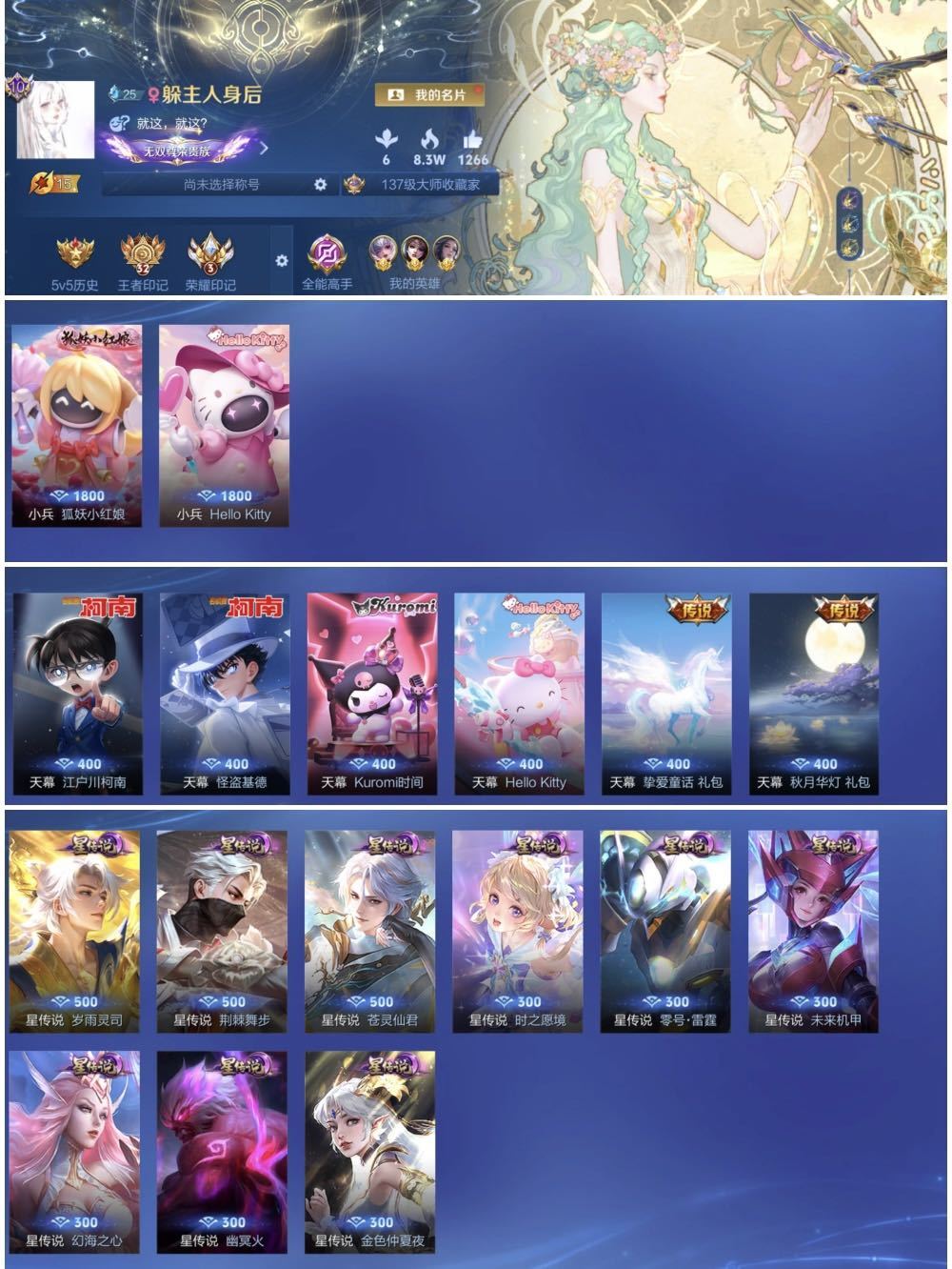 限制: 租号10次及以上 | 撤单率<10%才可租用此帐号装备描述:>>>>>>毁号,涉及毁坏虚拟财产罪及计算机安全罪,请文明游戏素质游戏,让我们共建美好租号平台>>>>>> 本游戏账号: V10用户,基础段位:最强王者,英雄多,皮肤多。典藏皮肤18个,感受典藏皮肤带来的优质体验快感,FMVP皮肤11个,尽情享受FMVP皮肤带来的主角光环, 私人所属英雄皮肤有:小乔 天鹅之梦||瑶 拾光映像||伽罗 最初的交响||孙尚香 杀手不太冷||武则天 倪克斯神谕||夏侯惇 无限飓风号||孙悟空 全息碎影||貂蝉 幻阙歌||鲁班七号 星空梦想||韩信 弑枪猎影||诸葛亮 星域神启||虞姬 神鉴启示录||关羽 赤影疾锋||铠 银白咏叹调||花木兰 九霄神辉||李白 鸣剑·曳影||程咬金 活力突击||芈月 大秦宣太后,等等 注意事项: A.游戏过程中请不要恶意挂机或者不文明发言;B.恶意挂机、顶号等行为将被拉黑无法再次下单;C.进入游戏后中途请勿退出登陆,否则无法再次上号;D.部分账号由于异地登录可能会出现密码错误提示,通常再尝试5-6次后可上号。 |||||||||>喜欢本账号请点 ☆收藏☆ 方便下次租用,谢谢光临惠顾|||||||||