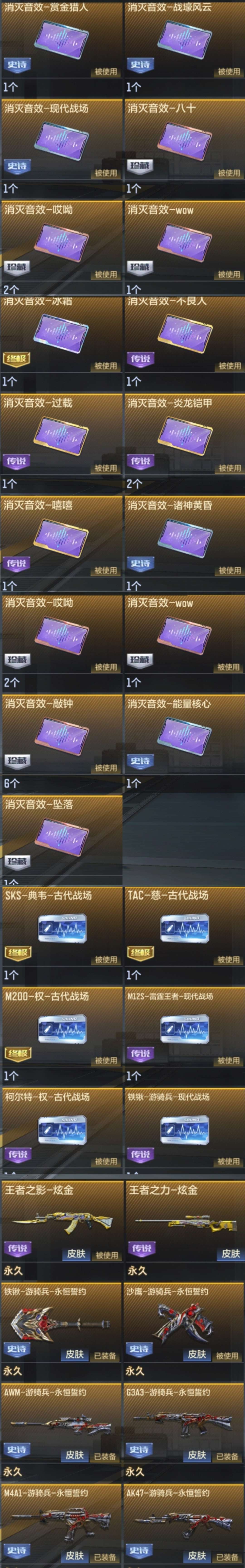 装备描述:恶意撤单 秒拉黑 ( 登不上,尝试多登录几次,号主绝不会挤号) ①租号前想好撤单秒拉黑,投诉不符秒拉黑,租错号秒拉黑,拒绝白嫖 ②图片均为真实图片 武器装备只会多不会少 ③请文明游戏,请不要在游戏里面辱骂他人 ④此号价值4w元请文明游戏不要使用第三方软件,如有违规,必追究到底 喜欢本账号请点 ☆收藏☆ 方便下次租用,谢谢光临惠顾!