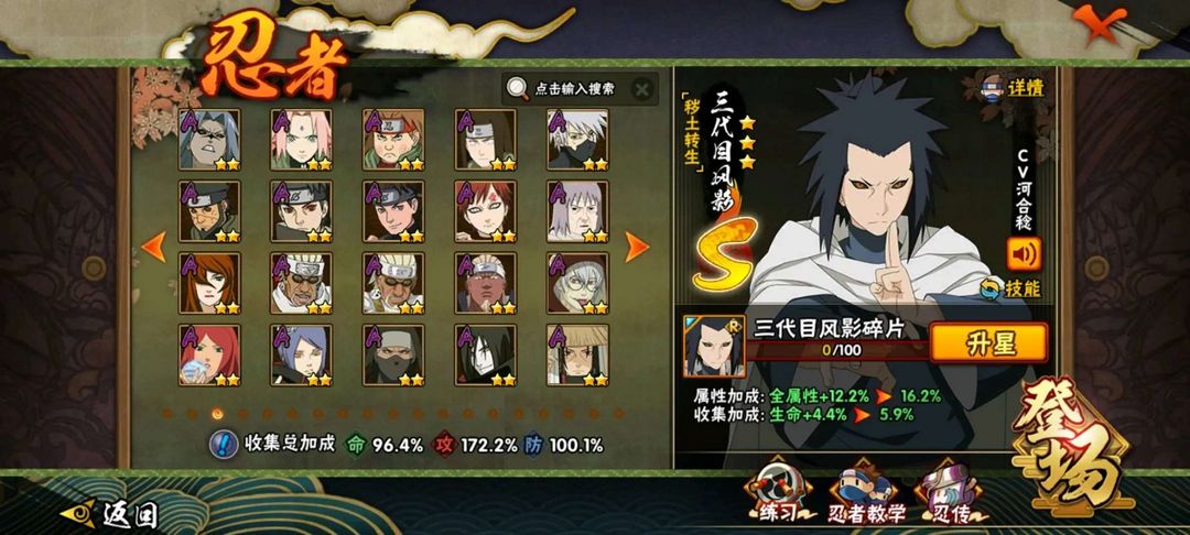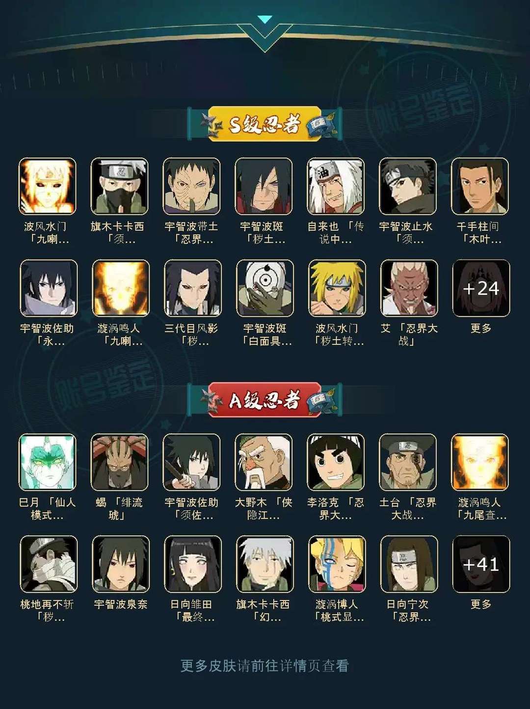装备描述:37S 54A ,须佐卡卡西,绯琉琥蝎,须佐止水,三代风影,仙自秽土解班长十郎 「六代目水影」/宇智波佐助「疾风传咒印」/漩涡鸣人 「九喇嘛连结」/宇智波带土「忍界大战」/宇智波佐助 「永恒万花筒」/迈特凯「死门」忍战宁次,千手柱间,秽土斑