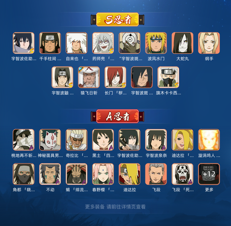 装备描述:长门秽土柱间 白面具 解斑 须佐卡卡西 龙兜 万花筒佐助 漂泊小南 面麻 百豪樱 沙娃 死迪 青年长门